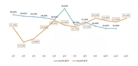 伴随全国解除二手车限迁政策的推进,从月度转籍比例的走势来看,2019年上半年的转籍比例明显高于历史同期,跨区域流通出现了非常明显的增长。第三季度的转籍比例与去年同期相比呈小幅下降趋势,11月份转籍比例和10月份基本持平。