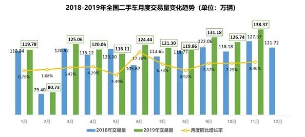 从2019年各月度交易走势来看,整体呈现缓慢持续增长趋势。11月全国二手车交易量为138.37万辆,月度同比增长8.46%,较10月份增速加快。