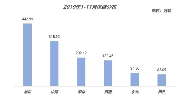 2019年1-11月,全国各大区二手车交易分布较为集中:其中华东地区占比超过三分之一,共交易442.99万辆,占全国交易量的33.47%。其次是中南和华北地区,分别为318.52万辆和202.12万辆,占全国交易量的24.06%和15.27%。三大区合计占比72.80%。西南、东北、西北分别交易了182.46万辆、94.5万辆、和83.05万辆,占全国交易量的13.78%、7.14%和6.27%。