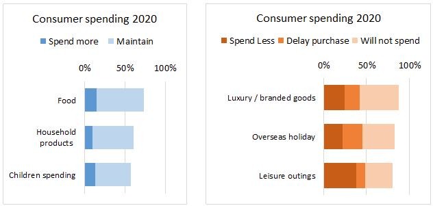 2020年,消费者将抑制奢侈品、海外度假和休闲郊游,同时保持在食品、家居产品和儿童支出等必需品上的支出。