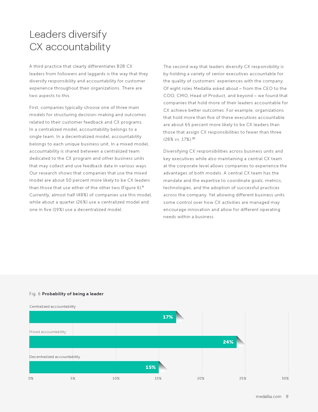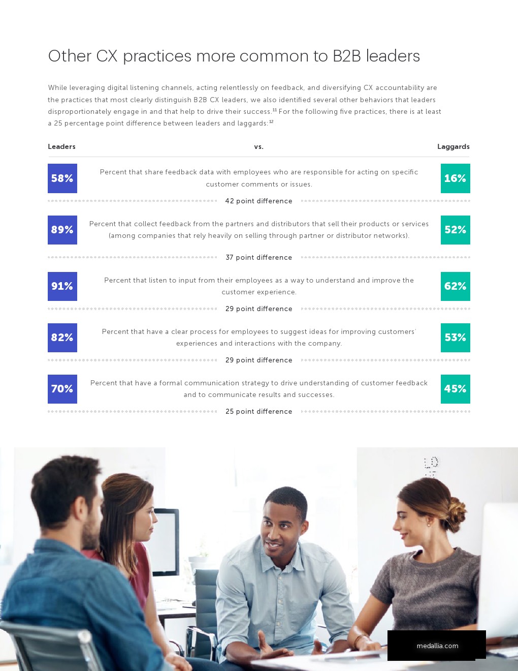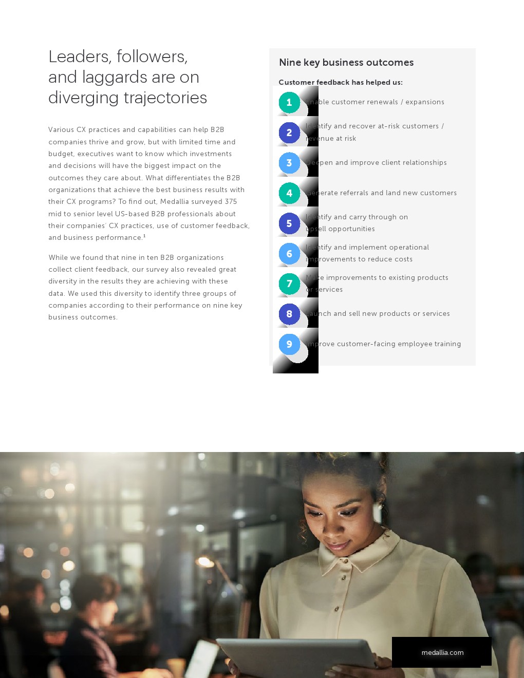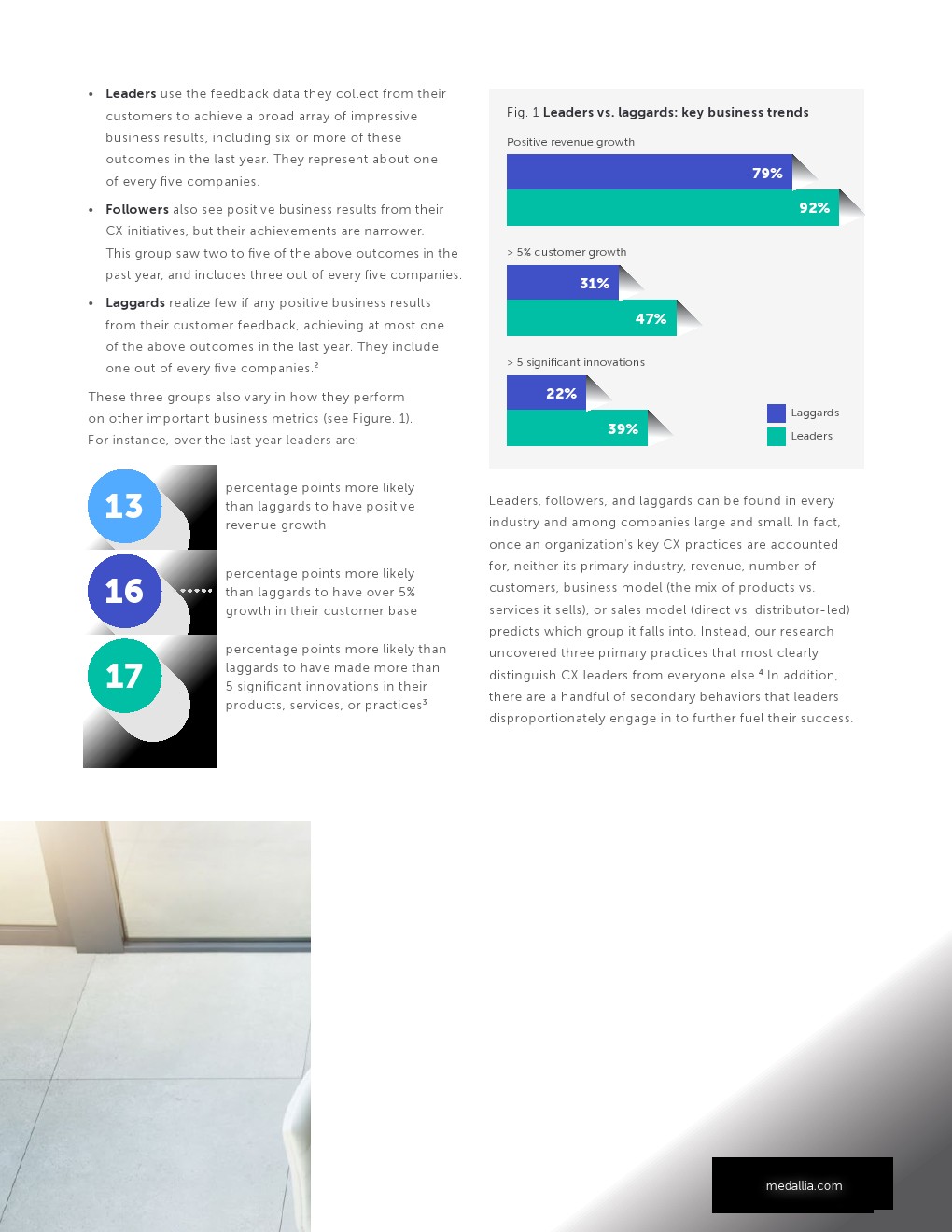 首先,该报告将受访者分为不同的类别,其中“领导者”是那些利用客户反馈实现9项业务成果中至少6项的客户体验专业人员。另一方面,“落后者”最多只取得了1项成果。