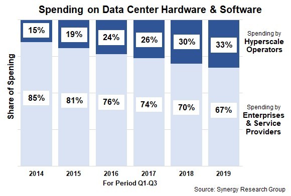 Synergy Research的最新数据显示,2019年前三季度,超大规模运营商占数据中心硬件和软件总支出的33%,高于2017年第一季度至第三季度的26%和2014年的15%。在同一时期,整个市场的规模增长了34%以上,这主要是超大规模运营商增加支出的结果。