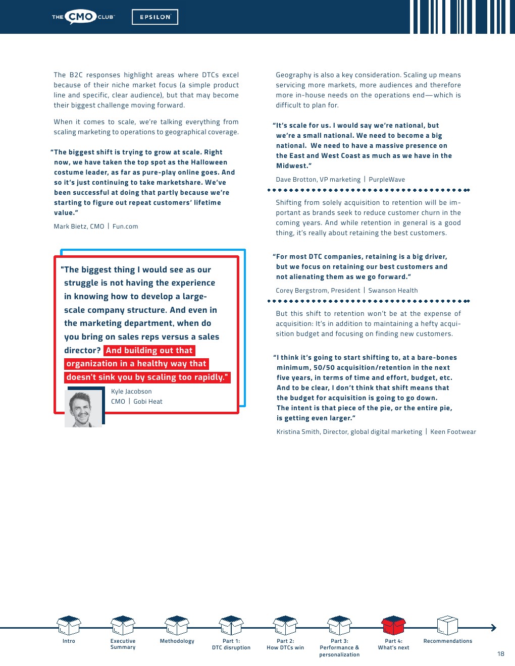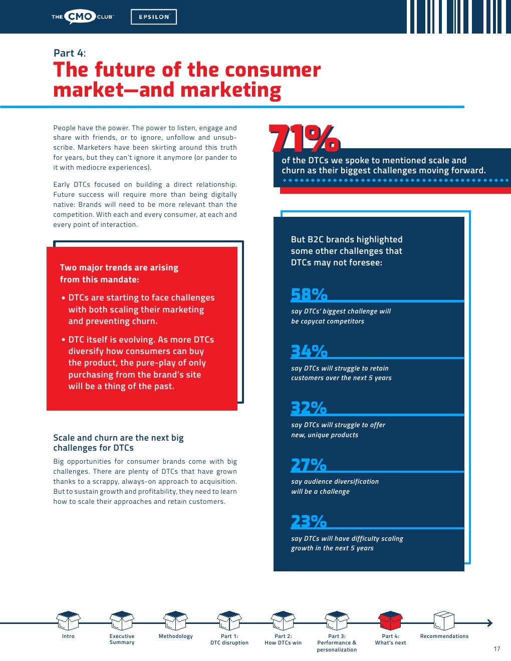 此外,老牌的B2C预计他们的DTC同行将努力应对竞争对手(58%)、客户保留(34%)、产品差异(32%)、消费者隐私法规(30%)、受众多样化(27%)和规模增长(23%)。
