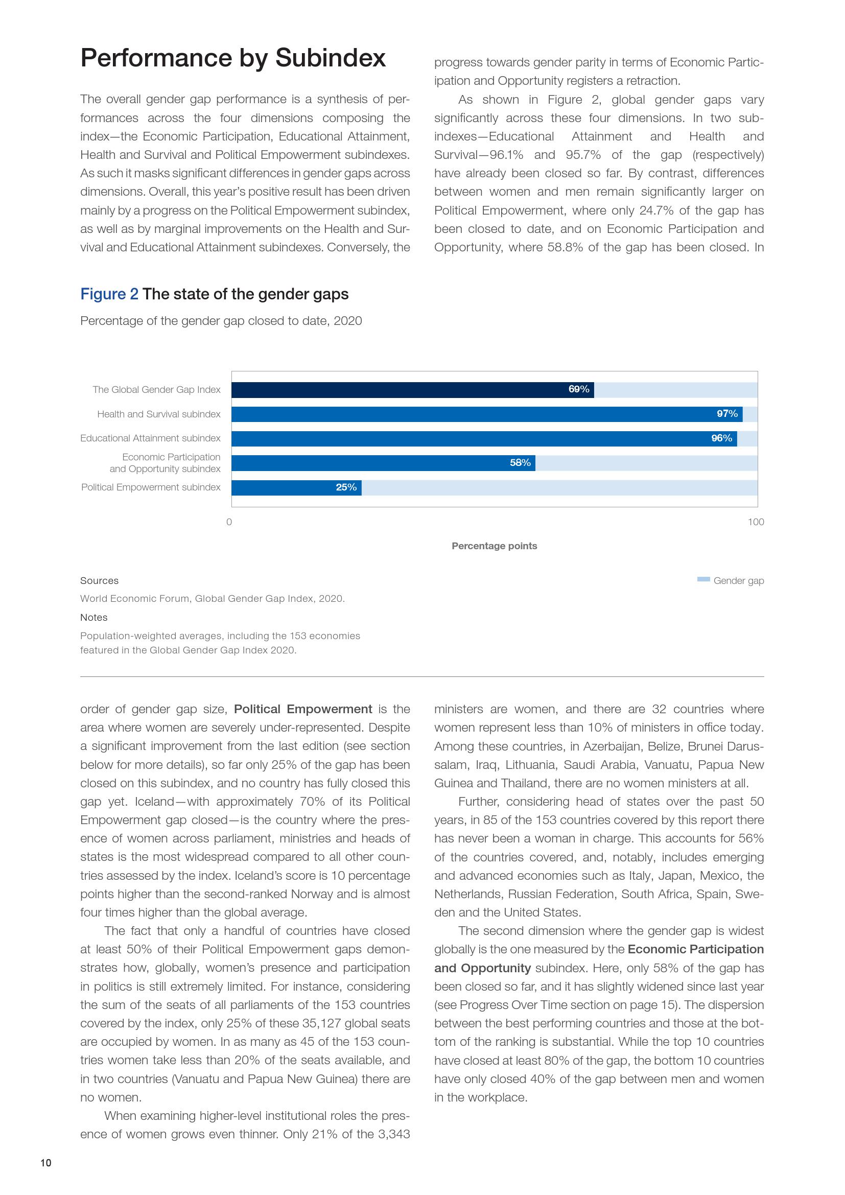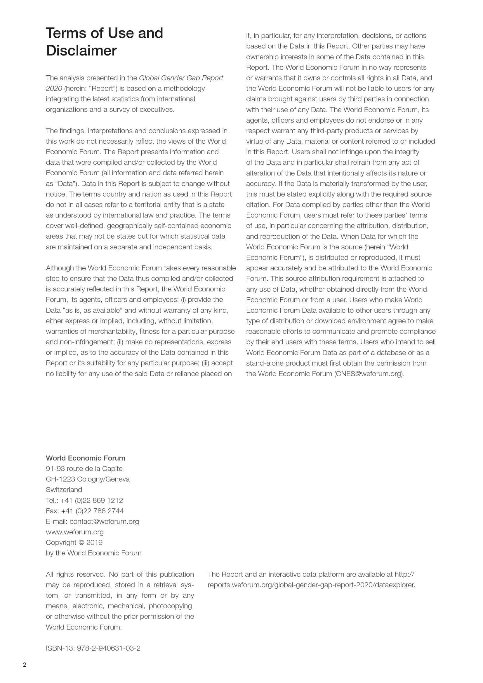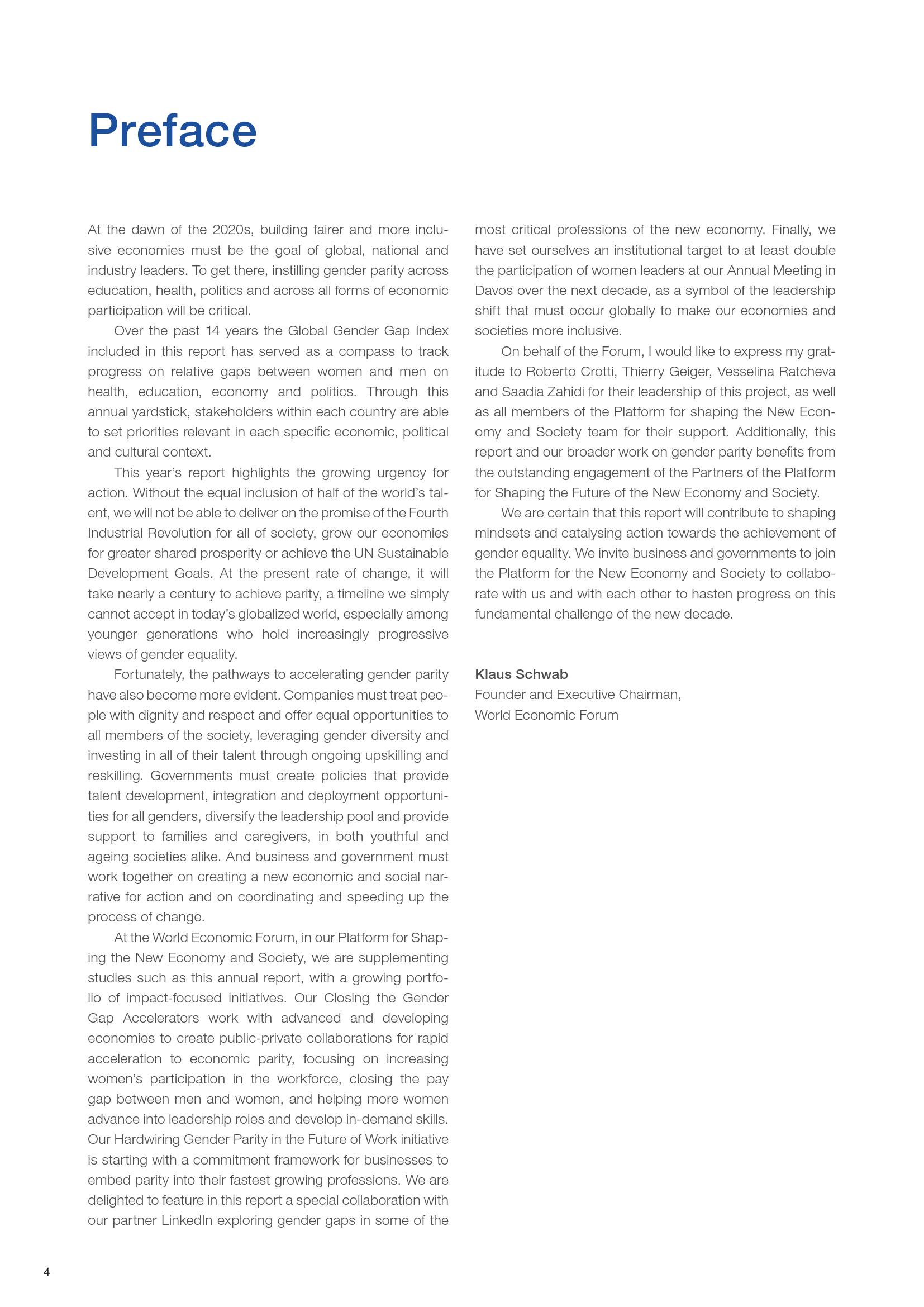 《全球性别差距报告》是世界经济论坛“塑造新经济和社会的未来”平台的旗舰出版物。该平台为相关各方提供机会,助力打造繁荣、包容和公平的经济和社会。平台重点在三大相互关联的领域共同制定全新愿景:增长和竞争力;教育、技能和工作;以及平等和包容。各利益相关方通过这一平台携手合作,深入了解各项复杂议题,制定新型模式和标准,推动各方加大协作力度,共同促进系统性变革。