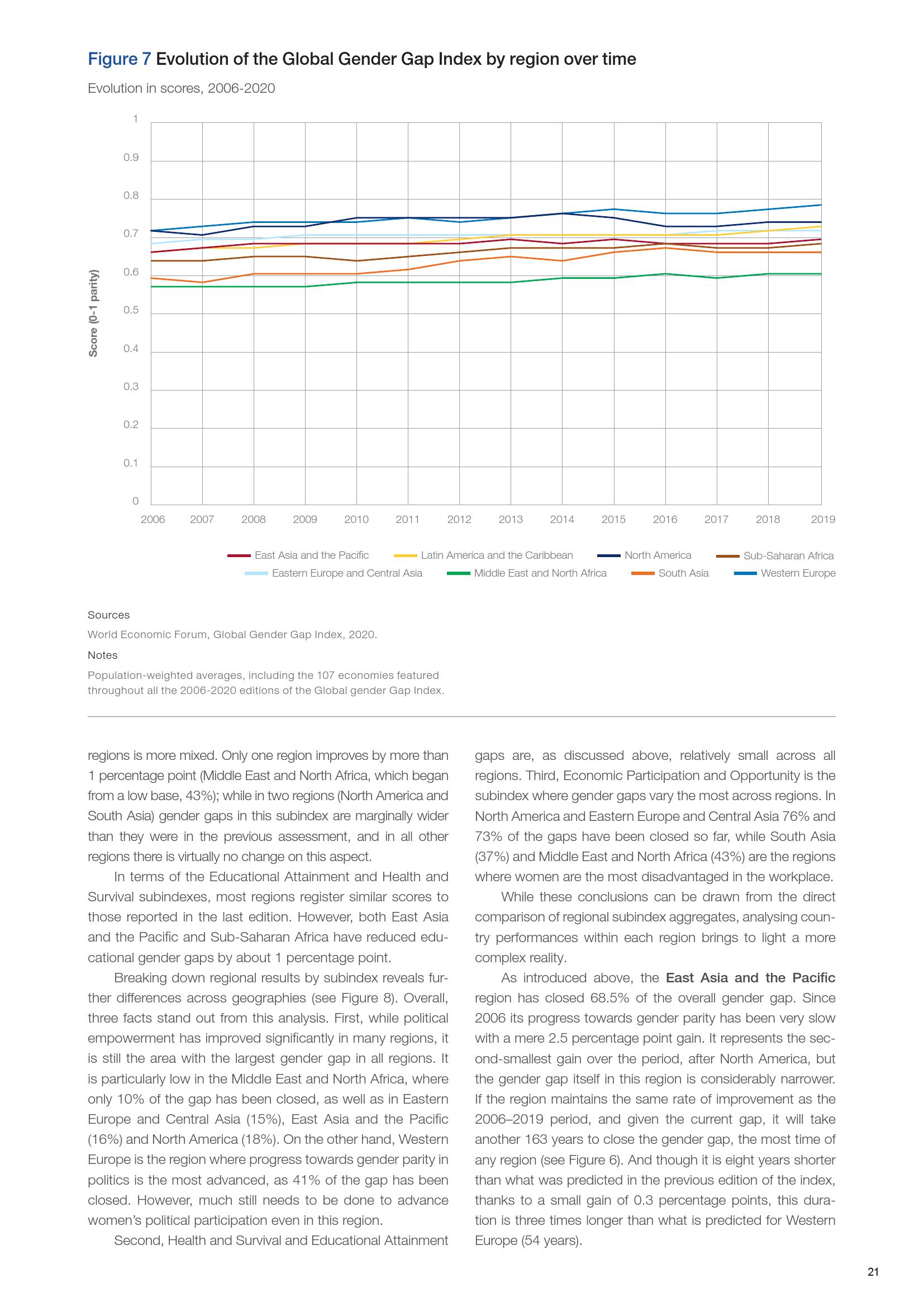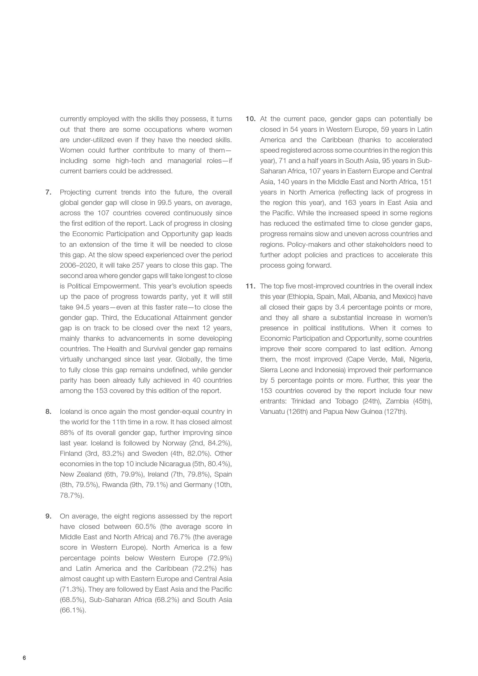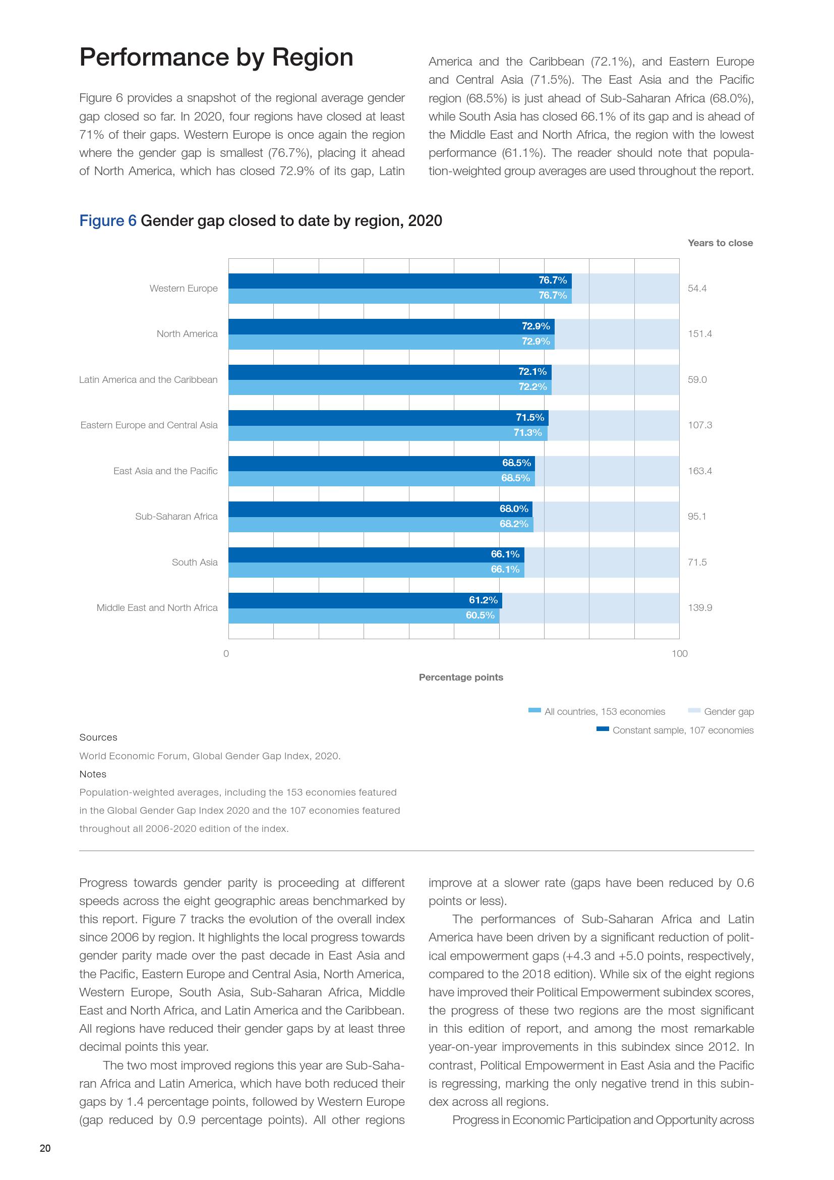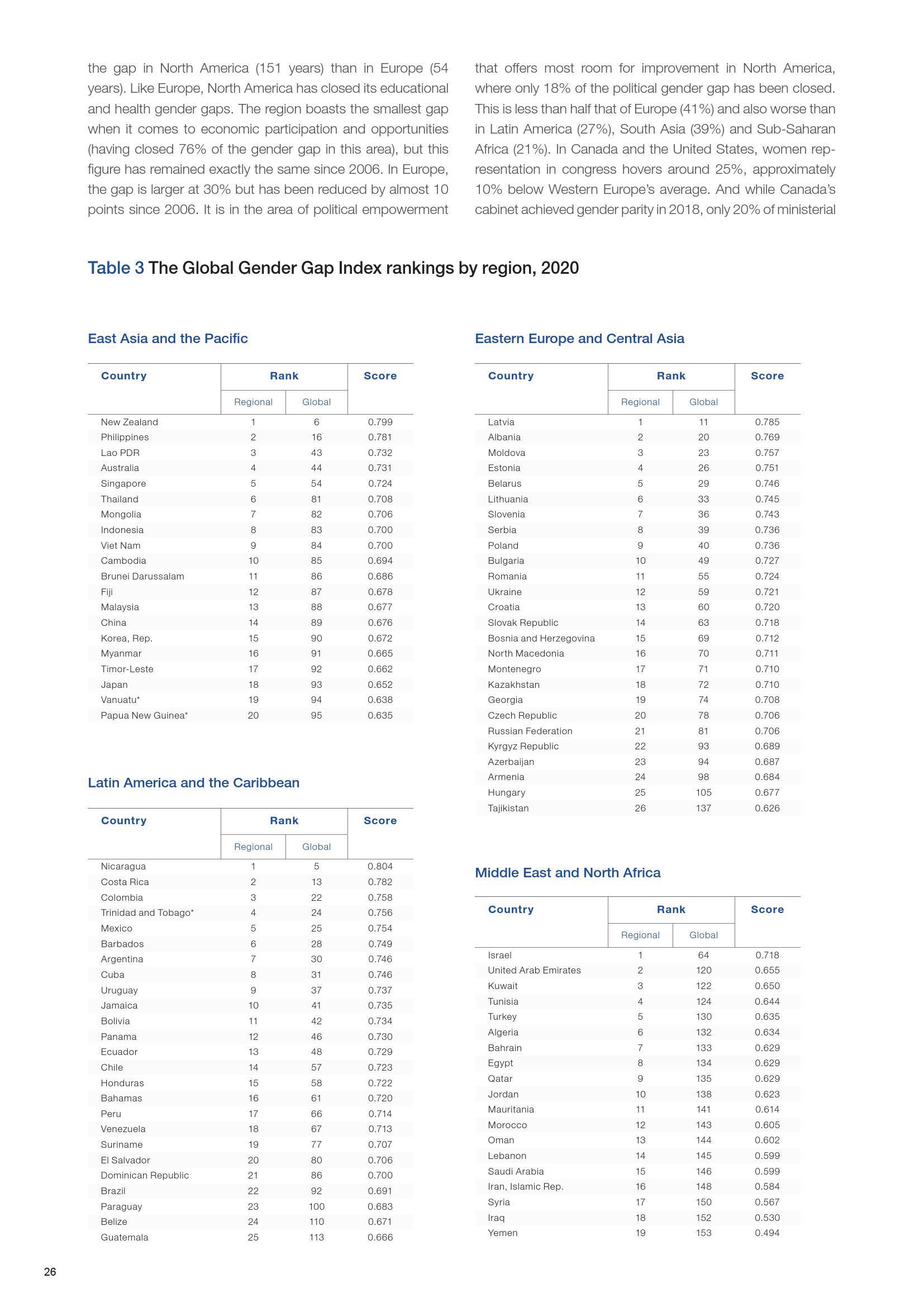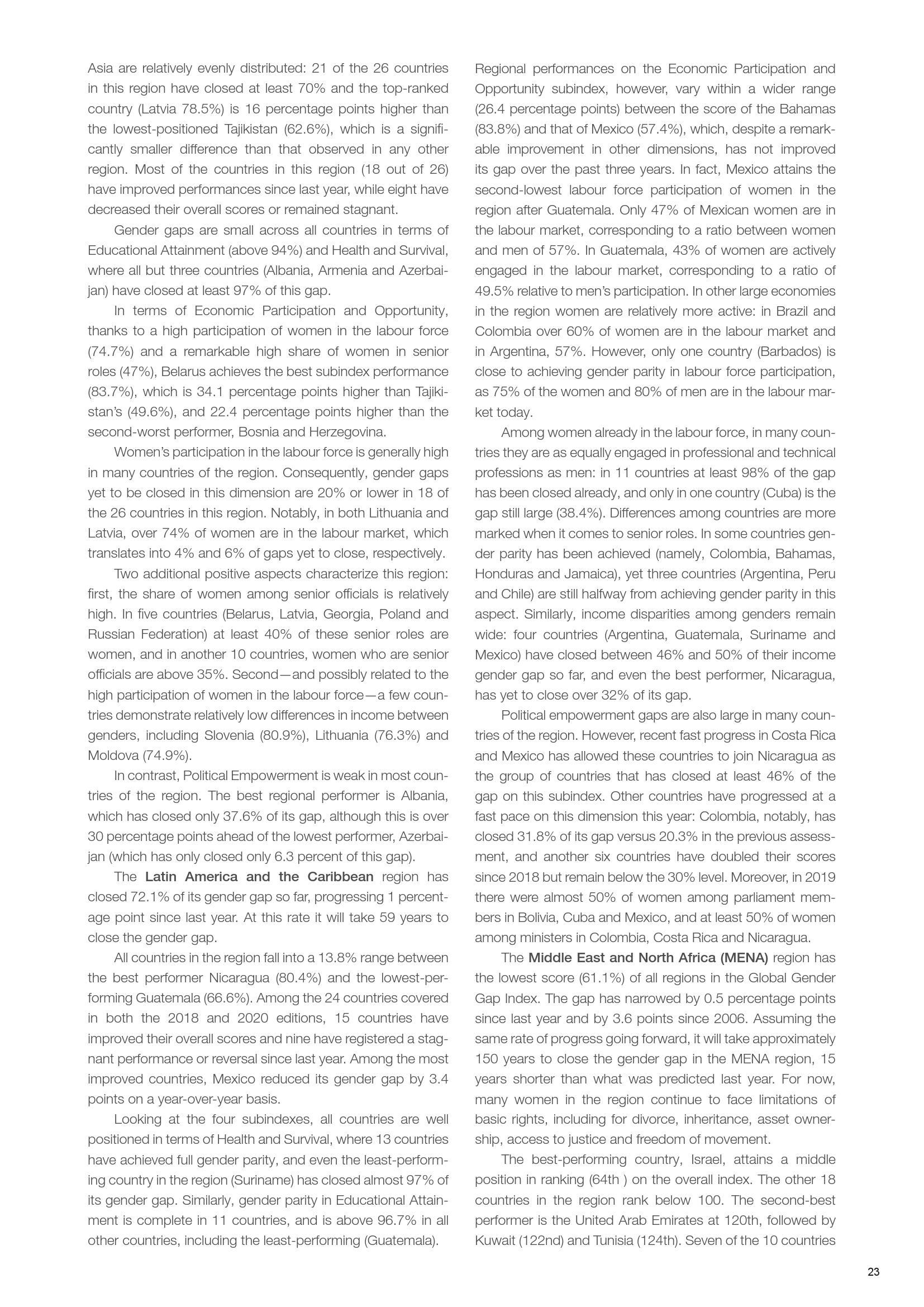 拉丁美洲和加勒比地区迄今已消除了72.1%的性别差距,和去年相比提高了一个百分点。照此速度,59年后该地区可以消除性别差距。该地区在政治赋权领域取得了最为显著的进步,和去年相比提高了5个百分点。报告对该地区的24个国家进行了评估,其中有15个国家改善了整体表现,而尼加拉瓜更是扮演了地区领头羊的角色(第5位,80.4%)。在进步最明显的国家中,墨西哥在去年基础上提高了3.4个百分点。
