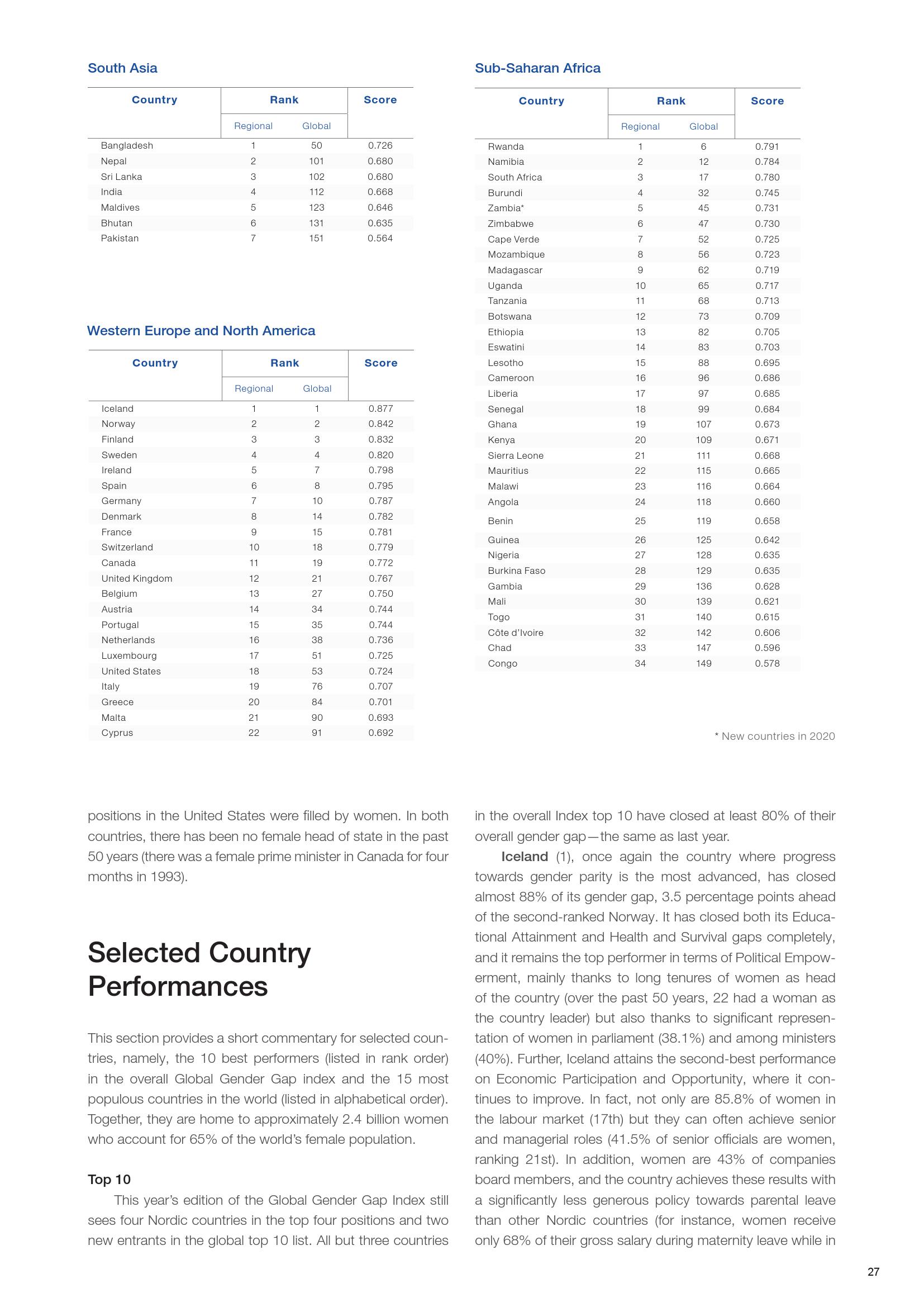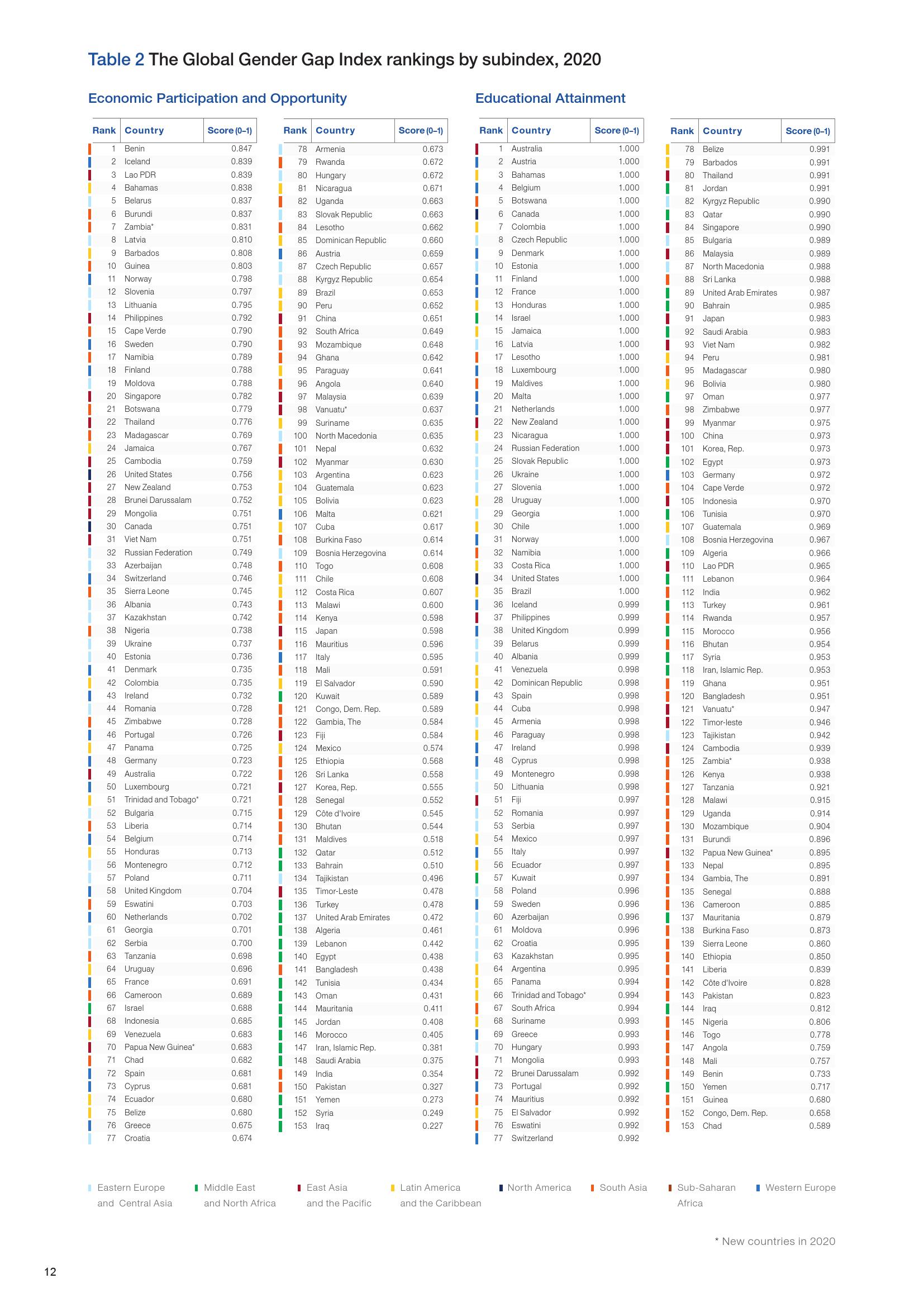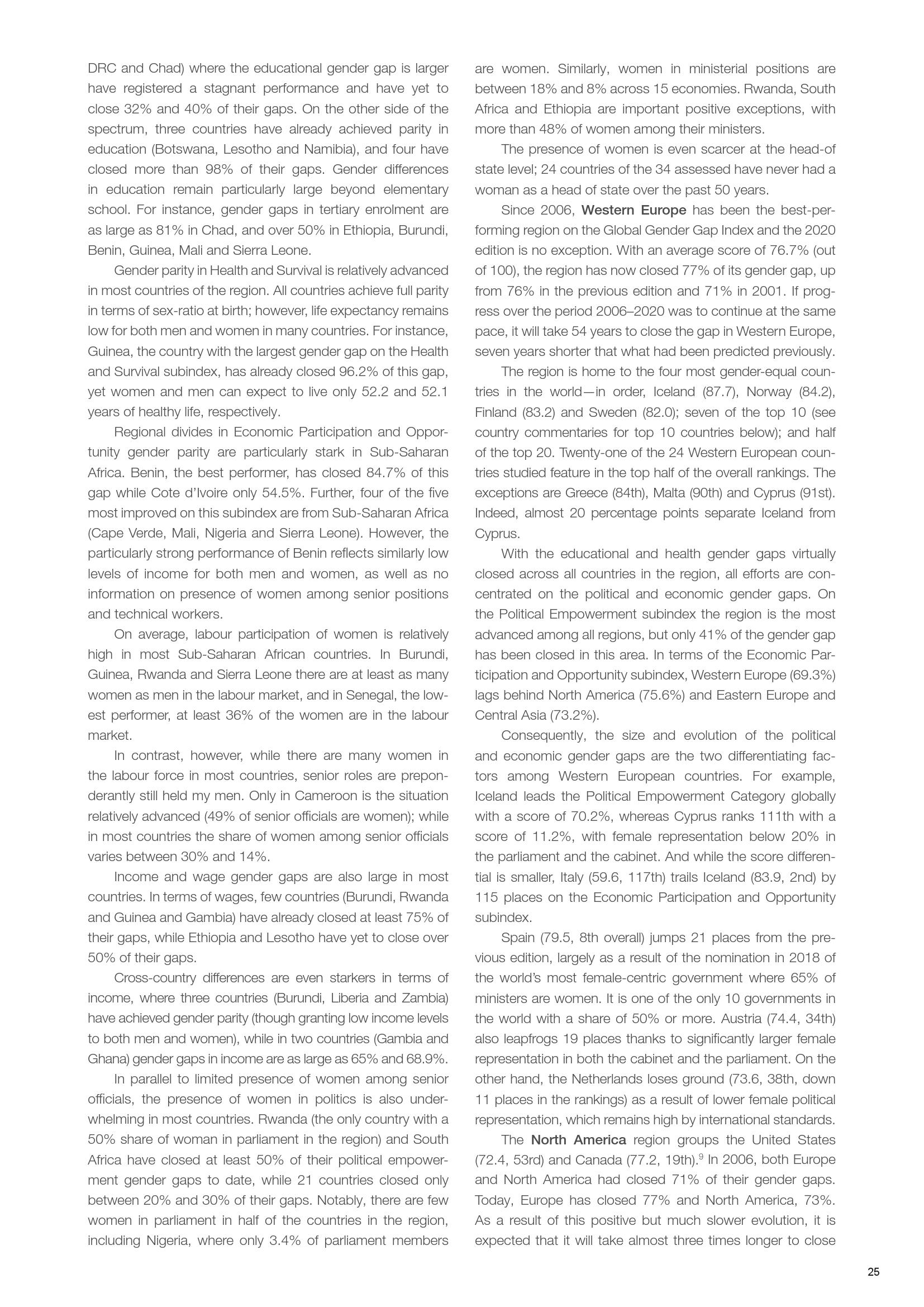 截至目前,撒哈拉以南的非洲地区已经消除了68.0%的性别差距,和上年度相比取得了重大进步,距离彻底消除性别差距所需的时间缩短为95年。排名前十的卢旺达(第9位)位于该地区,另外还有21个国家和去年相比取得了进步,特别是埃塞俄比亚(第82位)成为全球范围内进步幅度最大的国家之一。