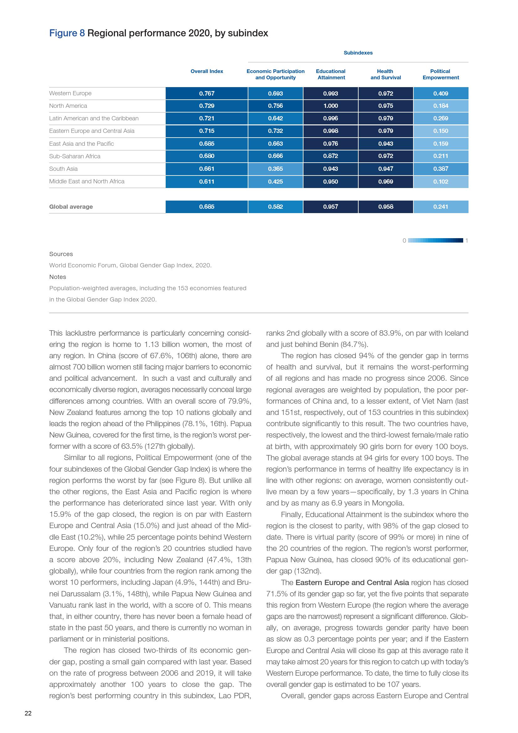 东亚和太平洋地区消除了69%的性别差距。鉴于目前所处的水平,如果保持2006-2019年期间的进步速度,该地区还需要163年才能彻底消除性别差距,是所需时间最长的地区之一。在四大评估指标中,东亚和太平洋地区在其中三项上取得了进步,但同时也是唯一一个在政治赋权方面性别差距继续扩大的地区(迄今仅消除了16%的差距)。表现最佳的国家是新西兰(第6位),消除了79.9%的性别差距,其次是菲律宾(第16位,78.1%)和老挝(第43位,73.1%)。