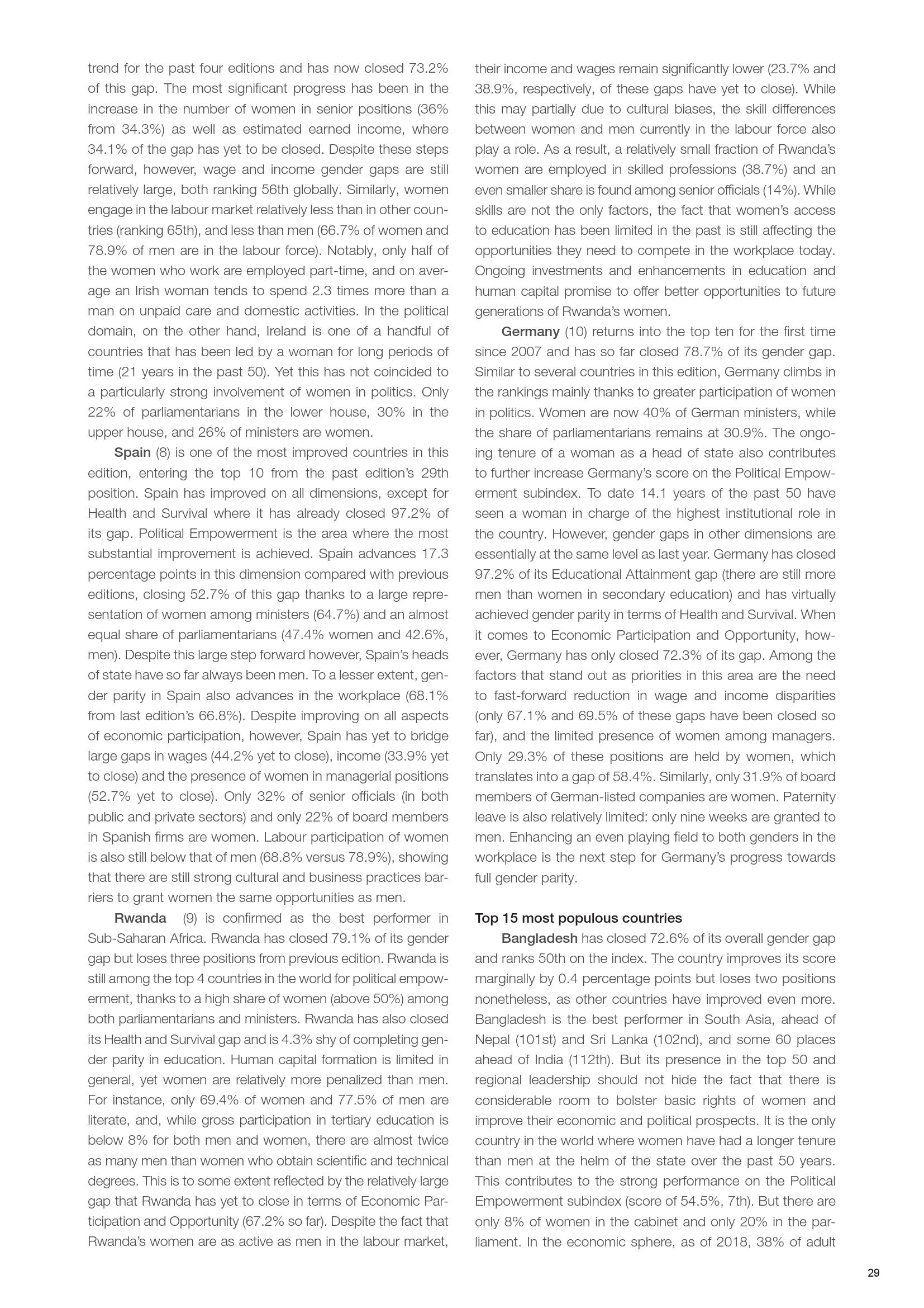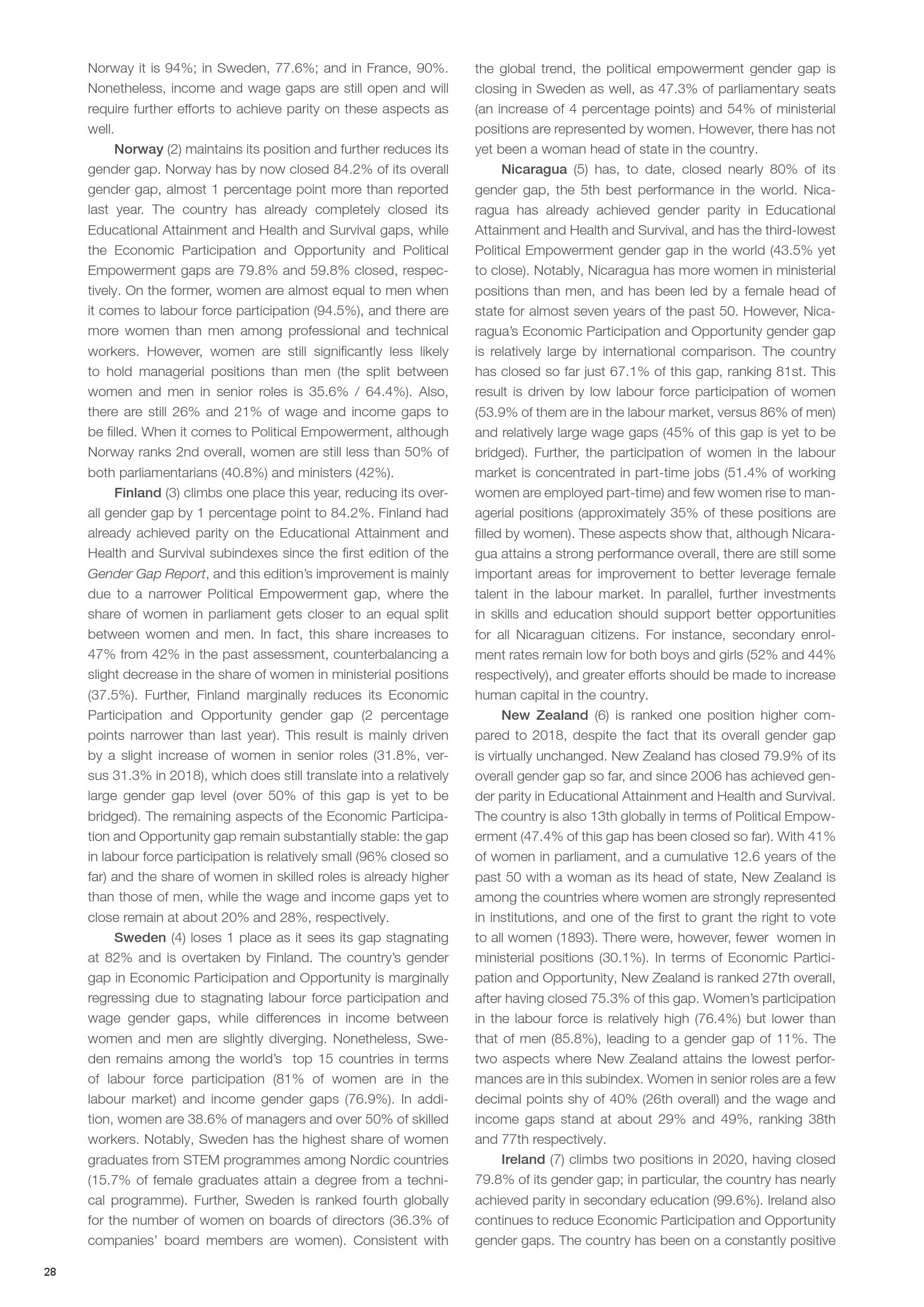 在追求性别平等的过程中,北欧国家继续领先世界。冰岛(87.7%)仍然是性别平等状况最佳的国家,接下来依次是挪威(第2位,84.2%)、芬兰(第3位,83.2%)和瑞典(第4位,82.0%)。前十名的经济体还包括尼加拉瓜(第5位,80.4%)、新西兰(第6位,79.9%)、爱尔兰(第7位,79.8%)、西班牙(第8位,79.5%)、卢旺达(第9位,79.1%)和德国(第10位,78.7%)。