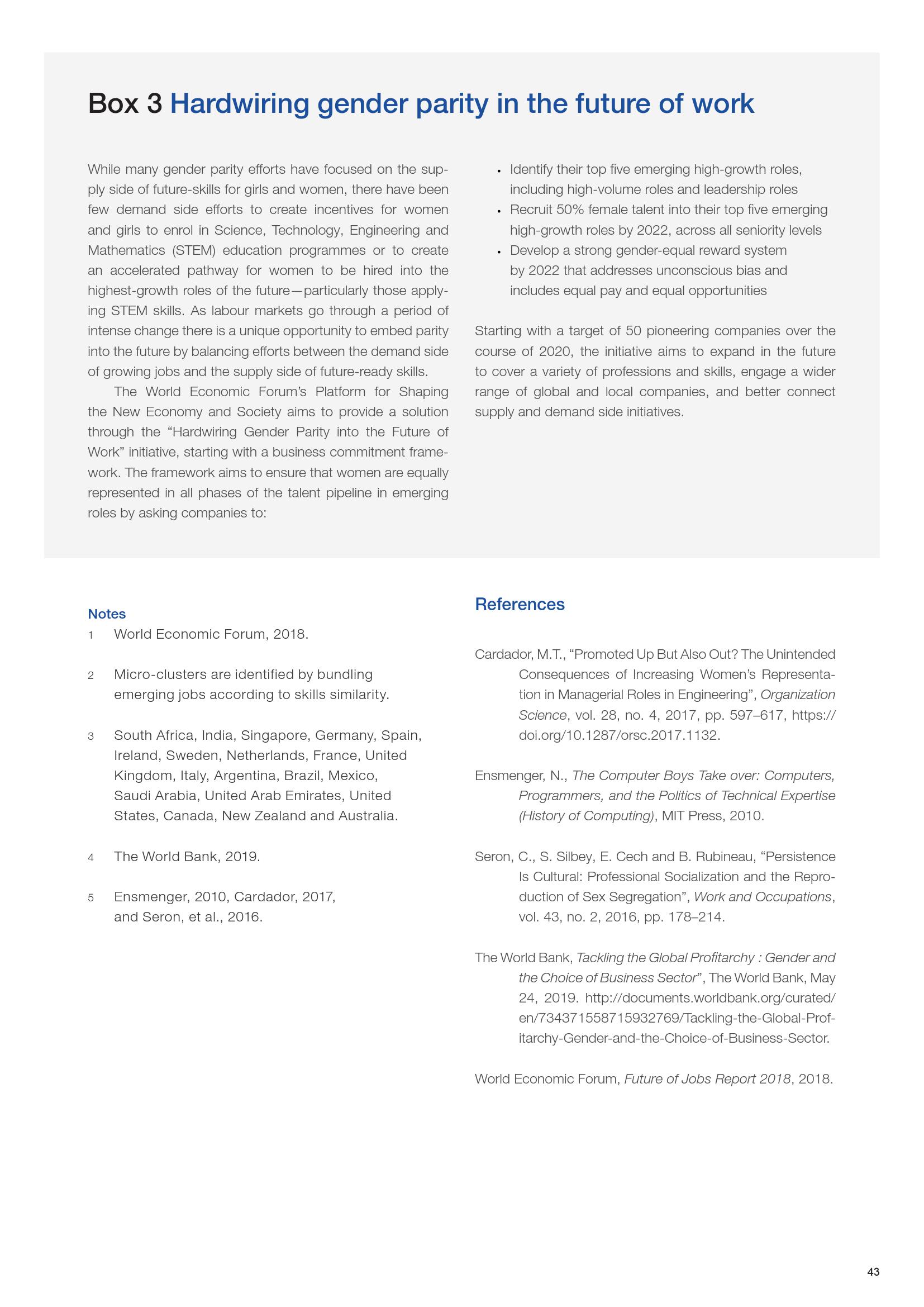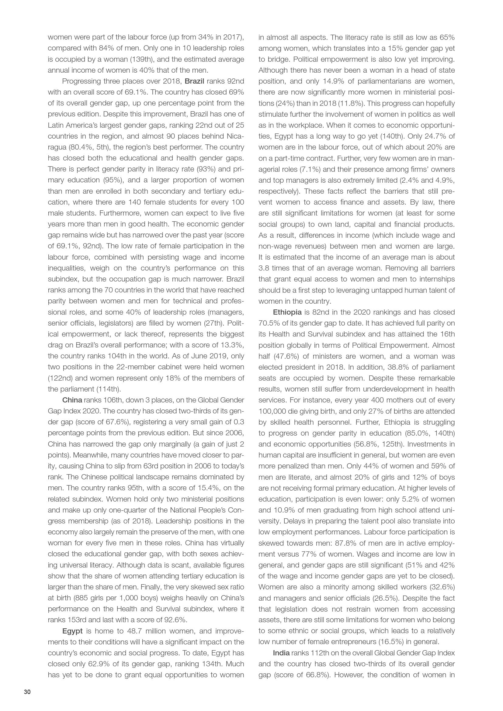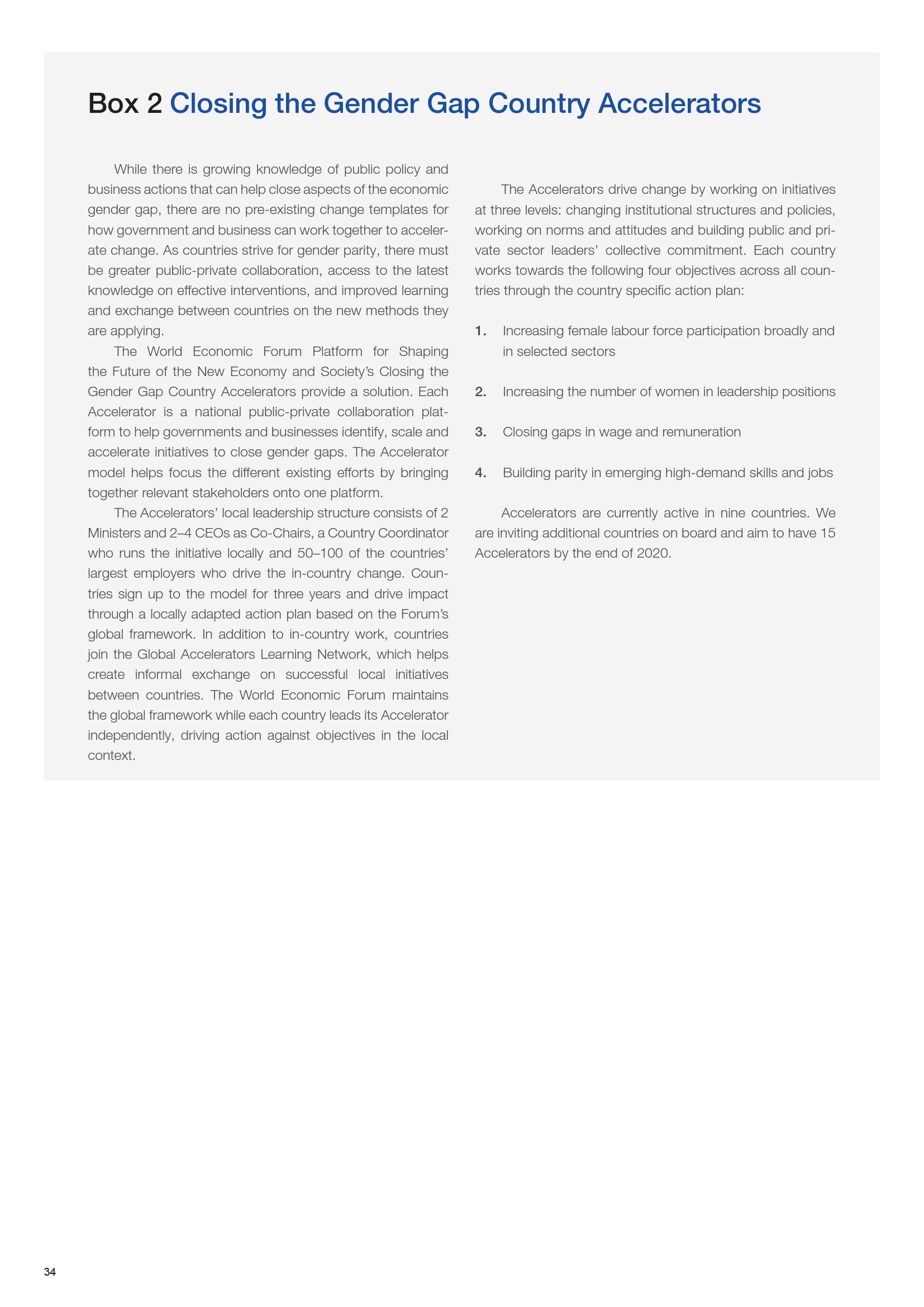 世界经济论坛“塑造新经济和社会的未来”平台旨在通过国家和国际行业合作来消除经济领域的性别差距。通过“消除性别差距加速器”项目,论坛致力于推动变革,在相关部委和国内最大雇主之间建立行动联盟,提高女性劳动力参与度,让更多女性走上领导职位,缩小工资差距并帮助女性为未来工作做好准备。此外,全球企业界开展“在未来工作中落实性别平等”项目,激励企业承诺到2022年之前,在其发展最为迅速的五大职位上雇佣50%的女性。最后,论坛已经承诺到2030年,将参加瑞士达沃斯-克洛斯特斯年会的女性参会者比例提高一倍以上。