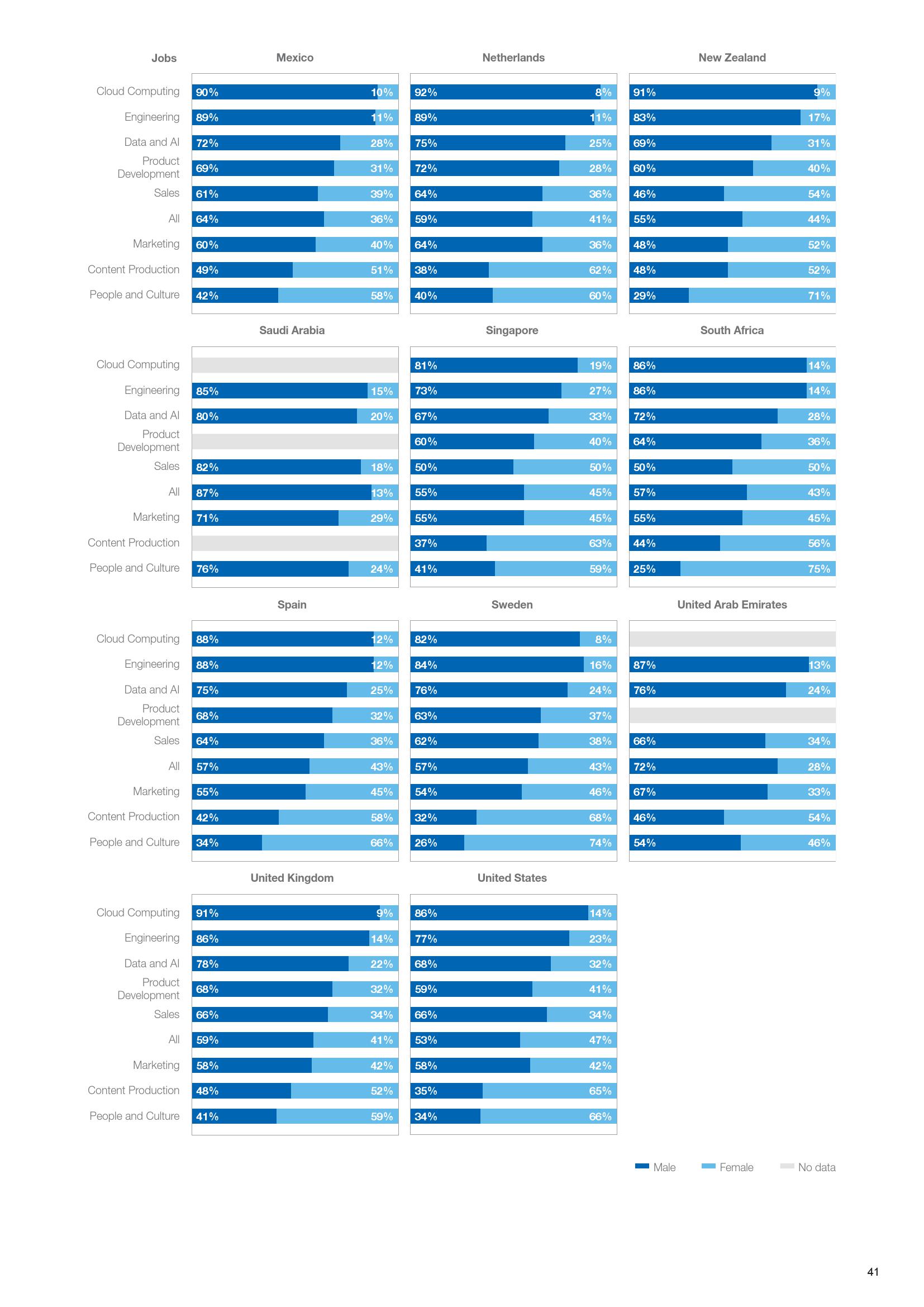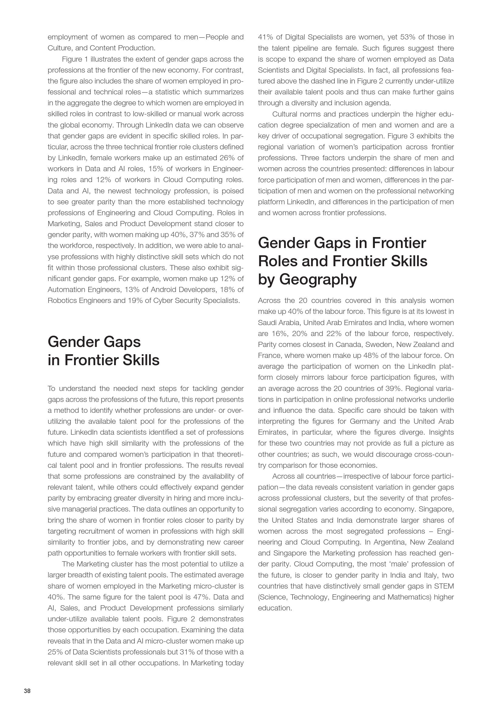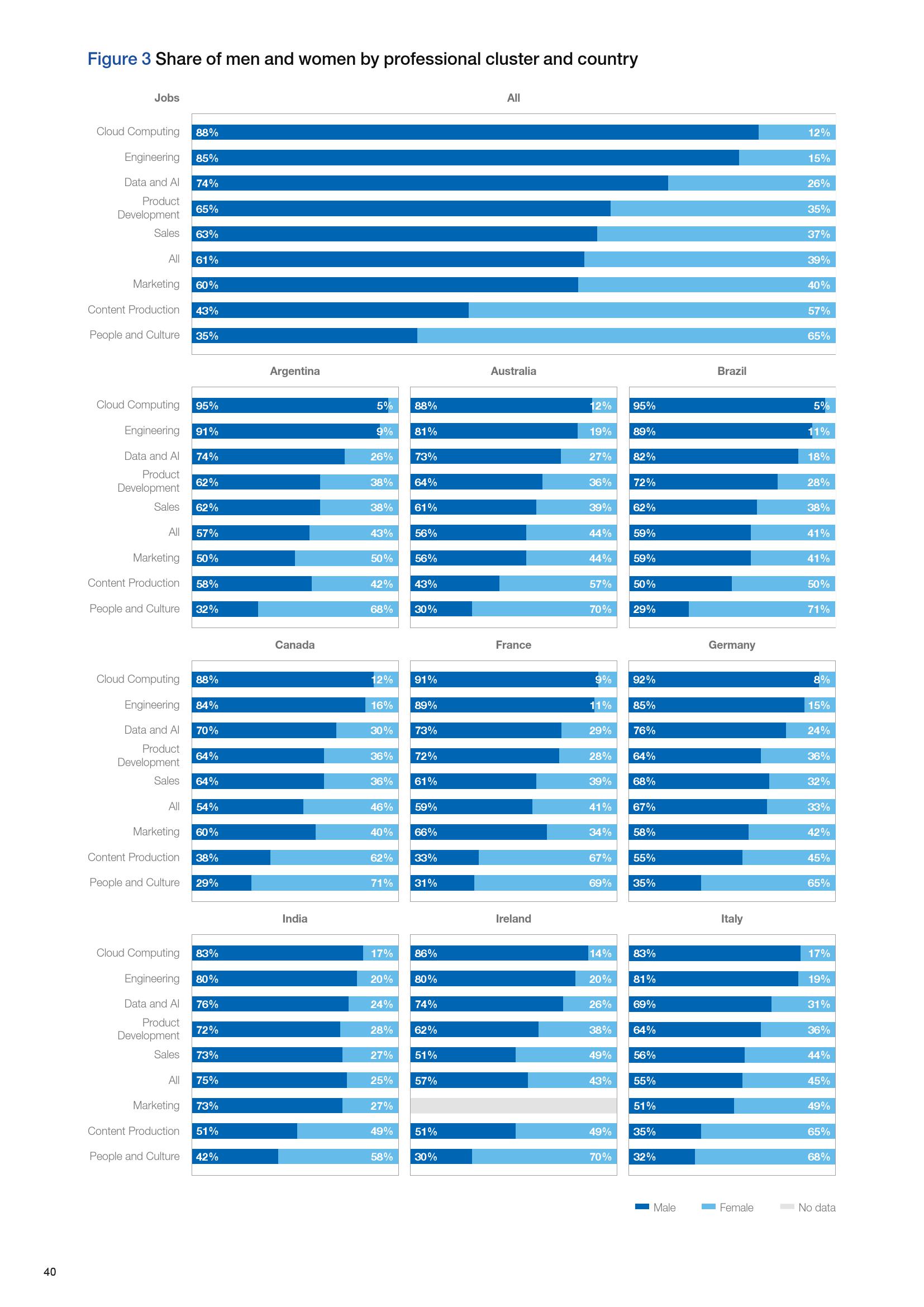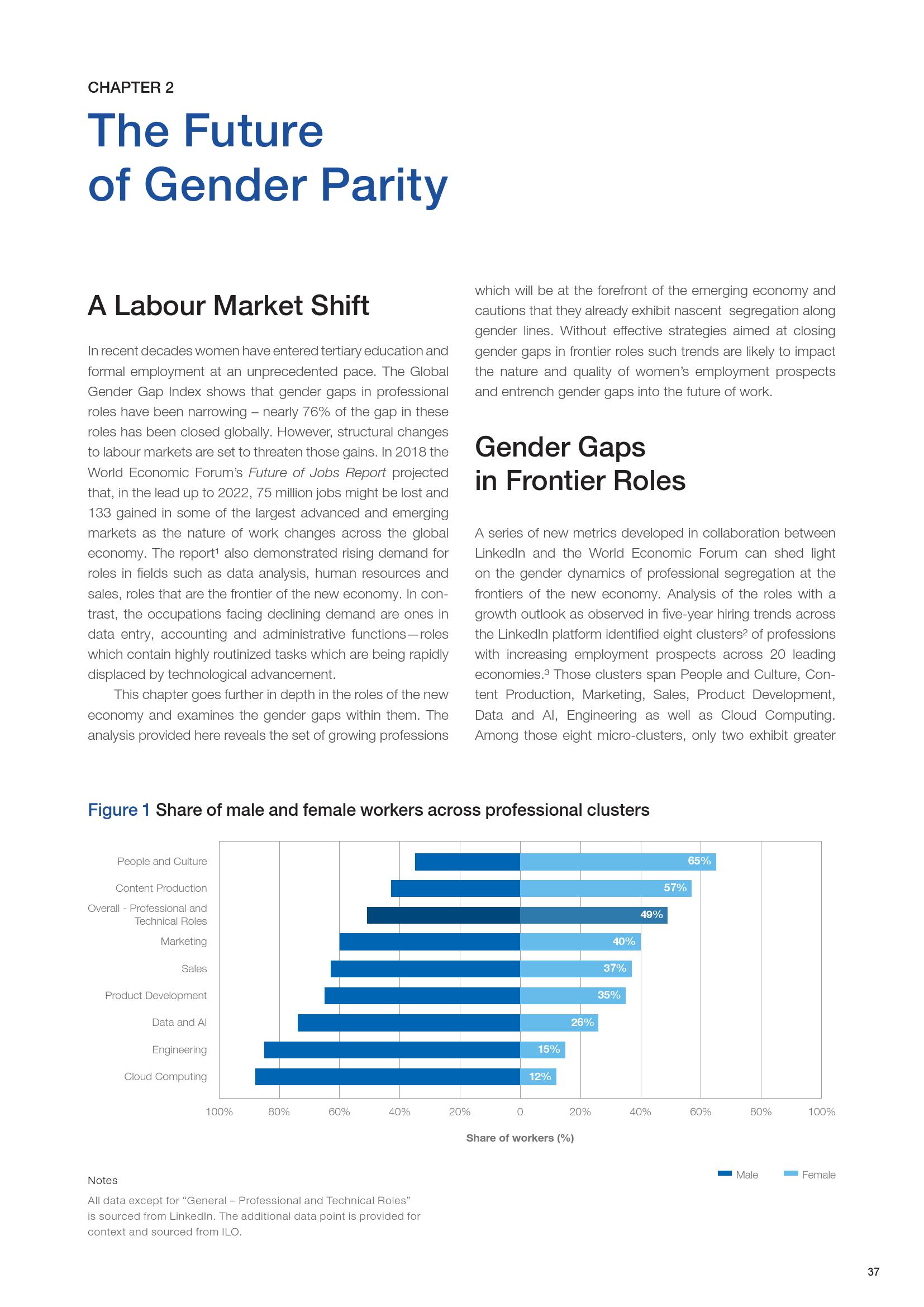 阻止经济领域消除性别差距的最大挑战可能是新兴职位的女性比例偏低。与领英(LinkedIn)联合开展的最新研究显示,在大多数新兴行业,女性比例普遍偏低。这种差距在“云计算”类职业中表现最为明显,只有12%的专业人士是女性。在“工程”(15%)和“数据和人工智能”(26%)等相关职业中的情况也不容乐观,但在“内容生产”和“人员与文化”两个快速增长的职业类别中,从业女性数量超过男性。