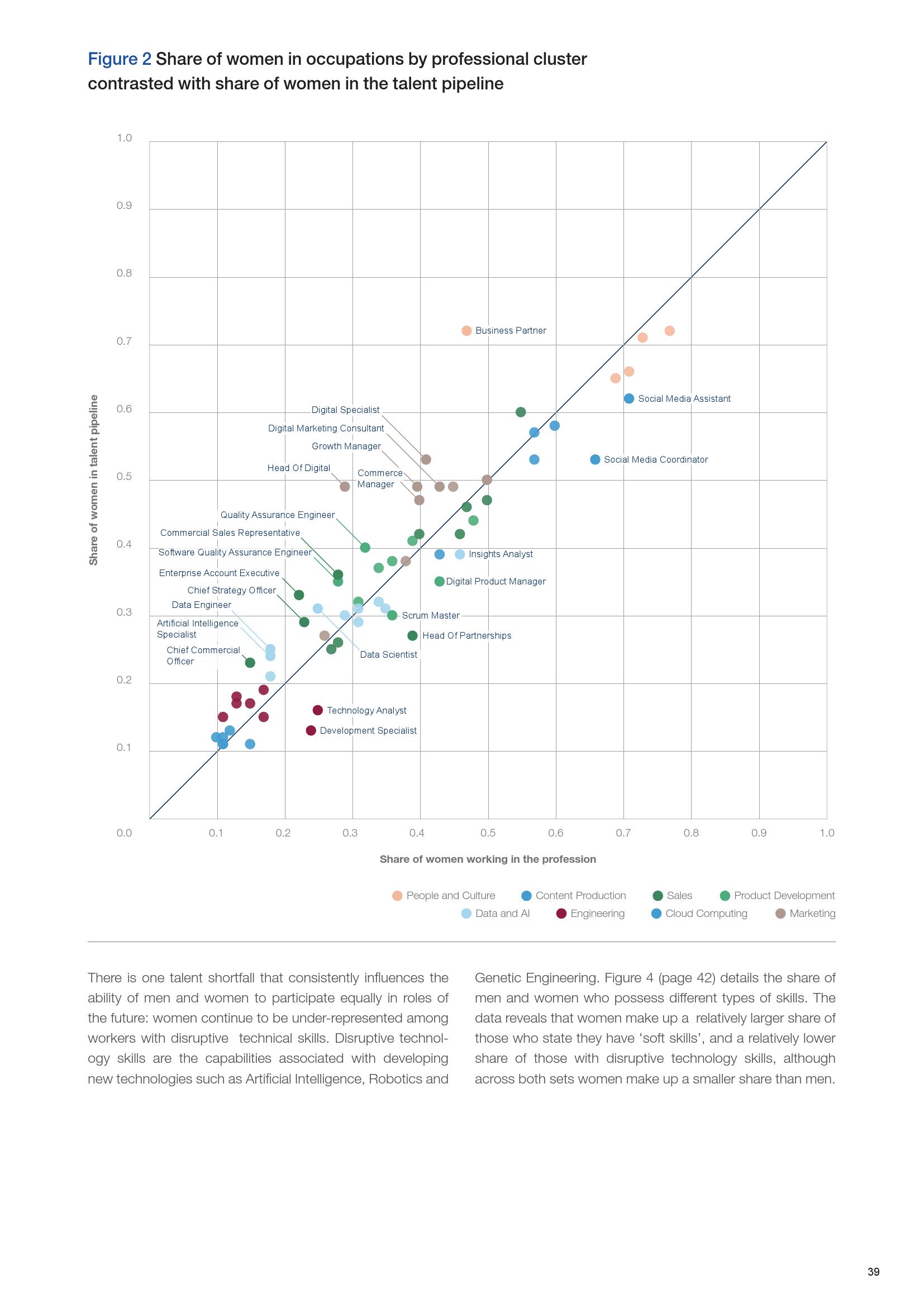 第二项挑战可能更加错综复杂。数据显示,即使女性具备相关且所需的技能组合,她们也未必能获得同等的就业机会。以数据科学领域为例。虽然拥有相关技能的女性占比31%,但拥有相关职位的女性占比仅为25%。同样,虽然数字专家的技能方面没有性别差距,但拥有相关职位的女性仅占41%。