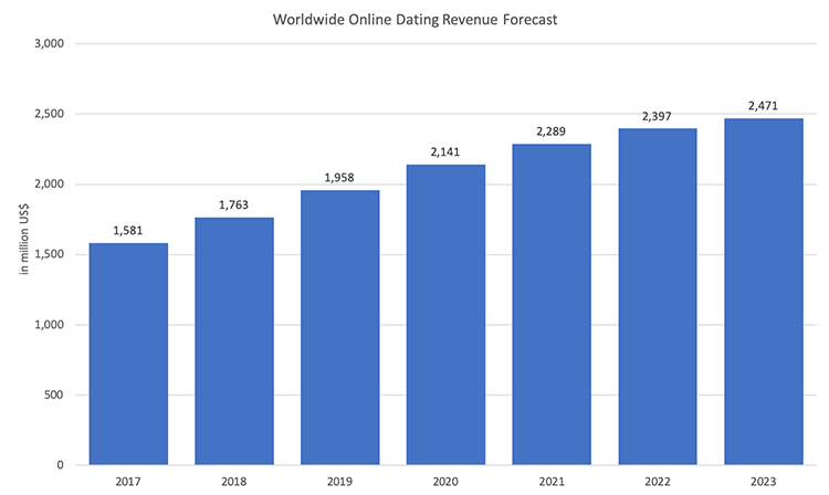 根据新娘研究集团《 2019 新娘真相调查》数据显示,25% 的单身人士使用约会交友服务,其中 16.9% 的单身人士使用线上约会交友服务。自 2015 年以来在线约会交友市场规模一直在增加,2019 年的线上约会交友市场规模已经达到了 4.6 亿美元,并且这一数据还在继续增长。