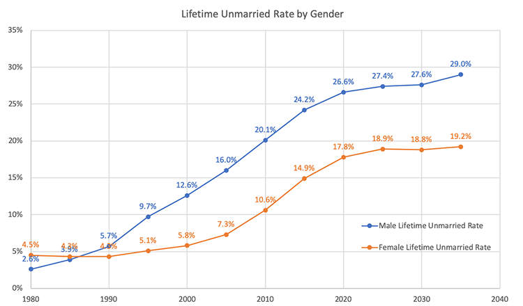 在过去的四十年里日本终身未婚率急剧增加。从 1980 年的 3.55 %,增加到了 2020 年的 22.2% ,其中男性终身未婚率高于女性,预计在 2035 年将会达到 29 %。