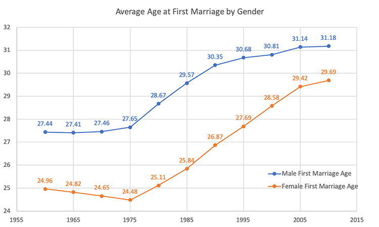 在日本晚婚已经成为一种常态。日本人的平均结婚年龄是 30 岁左右,比美国大 2 岁,比 1975 年的日本大 4 岁。25-34 的未婚人群,排在前 3 位的未婚原因主要是没有遇到对的人、经济还不稳定以及无法与异性很好地沟通。日本单身人士很缺乏约会交友的渠道与方法。