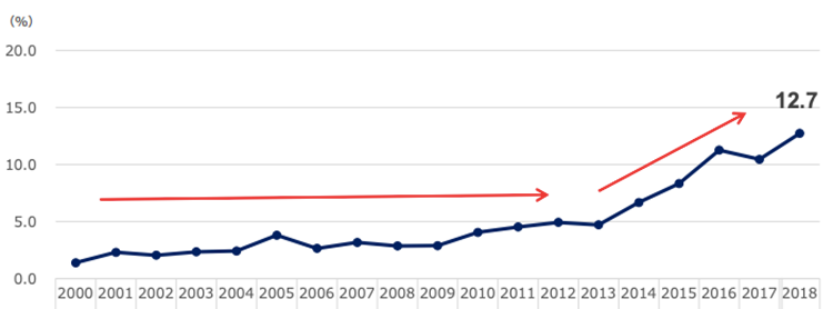 为了应对人口出生率下降、劳动年龄人口减少以及总人口数减少的问题,日本政府采取了积极行动,来推动日本约会服务的发展。日本政府通过采取为新婚低收入夫妇提供生活补助金、向地方政府拨款促使其建立婚介机构以及举办婚介派对等行动,缓解人们对于约会交友服务的排斥,有力地促进了结婚率以及出生率的提升。通过约会交友服务认识的已婚夫妇的比例在 2018 年达到了近 20 年最大值。
