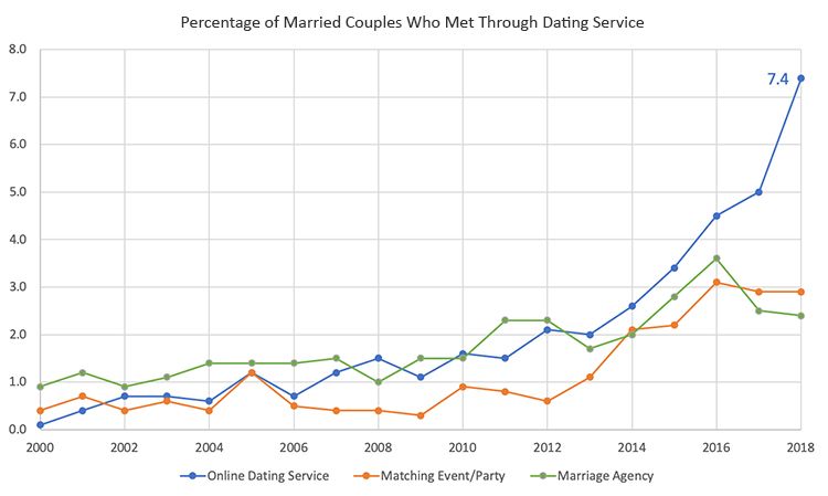 其中,线上约会服务在三种类型的约会服务中处于领先位置。在 2018 年通过线上约会服务认识的新婚夫妇的比例为 7.4%,比通过婚介派对和婚姻介绍所认识结婚的比例总和还多了将近 2%。