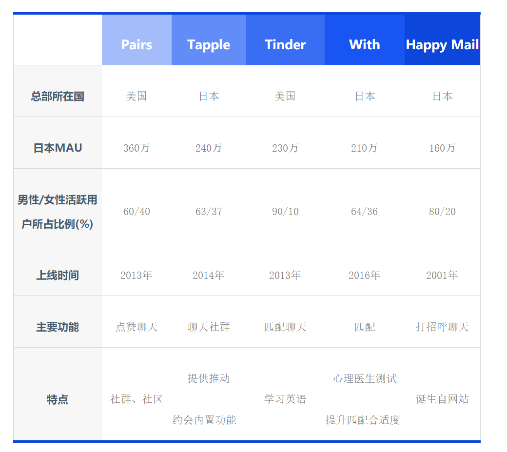 五款约会交友应用的 MAU 按顺序排列分别是:Pairs、Tapple、Tinder、With 以及 Happy Mail,我们通过表格简单了解一下这五款应用。