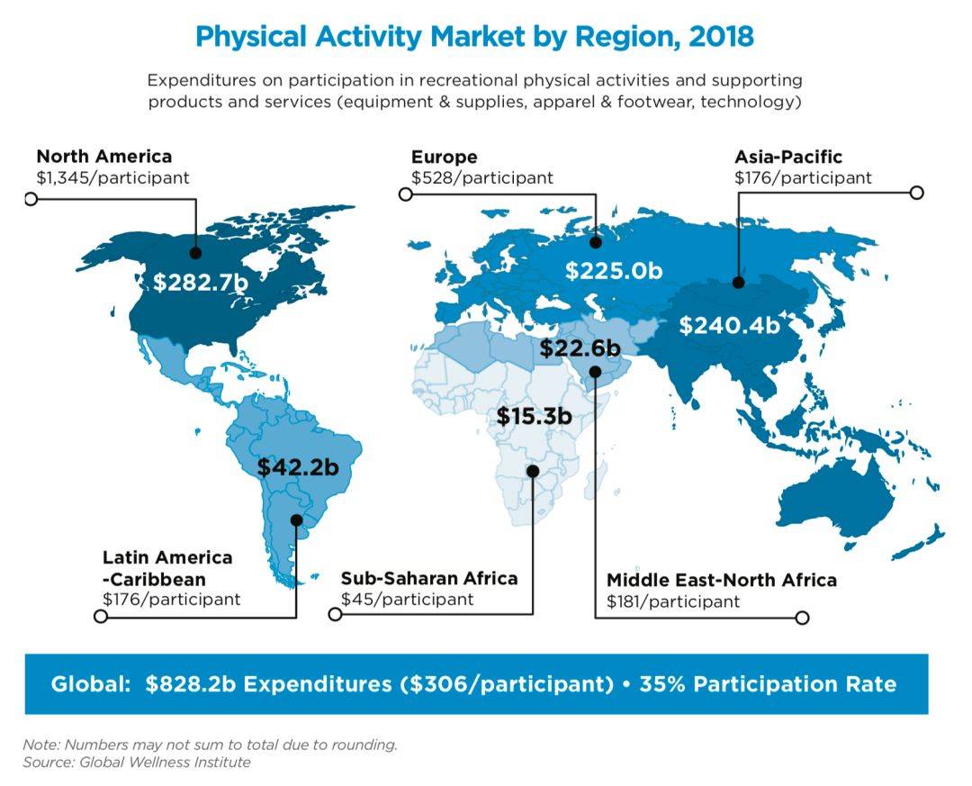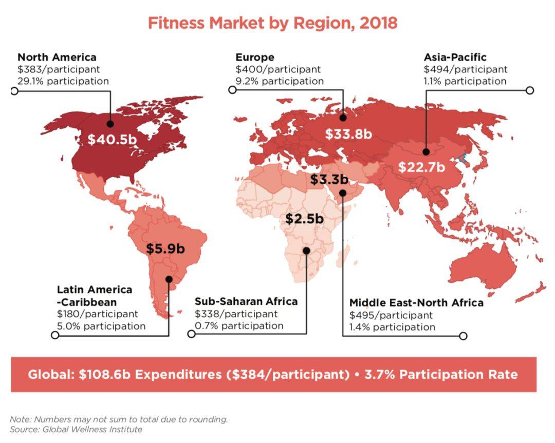 全球健身行业总规模为1086亿美元,人均为健身的消费为384美元。