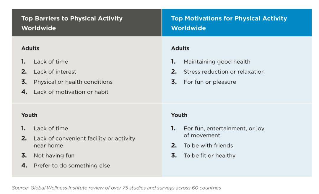 除此之外,报告分析认为,阻碍全球成年参与运动健身的四大原因,分别为缺少时间、缺少兴趣、运动和健康状态以及缺乏动力和习惯。