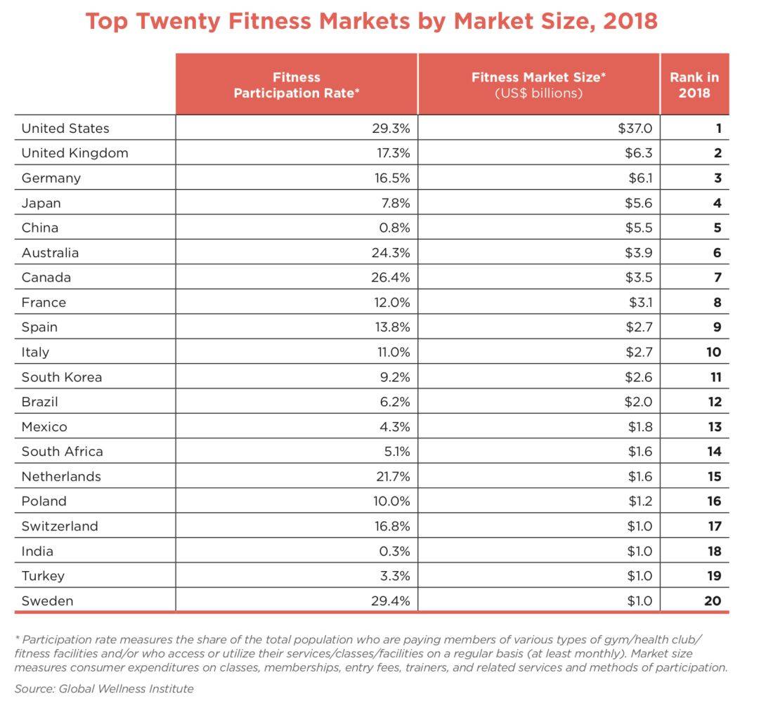而排第一的美国,健身人口渗透率已经达到29.3%,是中国的30多倍。全球排名前20的市场中,只有印度0.3%的渗透率低于中国,其他国家的健身渗透率都远高于中国。