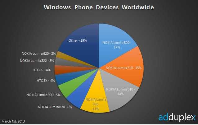 从上面的图表可知,诺基亚的Lumia产品线几乎主导了市场,而Lumia 800则占据了17%的领衔地位。新款低预算的Lumia 620首次亮相,而其它老旧的Windows Phone 7设备(像是HTC Radar和三星Focus)都被无情地划归到了”其它”类别里。