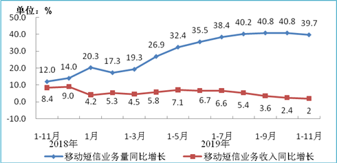 移动短信业务量收入增速远低于业务量增速。1-11月,全国移动短信业务量同比增长39.7%,增幅较1-10月回落1.1个百分点,移动短信业务收入完成358亿元,同比增长2%,增速较1-10月回落0.4个百分点。