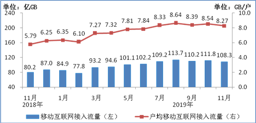 移动互联网流量保持高速增长,增速逐月回落。1-11月,移动互联网累计流量达1107亿GB,同比增速降至77.4%,较1-10月下降6.2个百分点;其中通过手机上网的流量达到1101亿GB,占移动互联网总流量的99.5%,同比增速降至78.8%。11月当月户均移动互联网接入流量(DOU)达到8.27GB,同比增速由上年末132.5%降至42.7%。