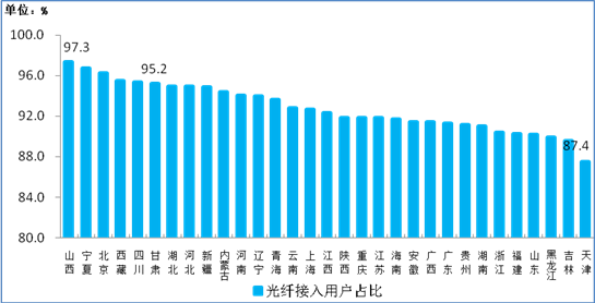西部光纤接入用户渗透率领先。截至11月底,东、中、西和东北部地区光纤接入用户分别达到18417万户、10107万户、10759万户和2494万户,占本地区固定互联网宽带接入用户总数的比重分别为91.5%、93.3%、93.5%、91.6%,西部地区占比小幅领先。各省光纤接入用户占比差异继续缩小,山西、宁夏、北京、西藏、四川和甘肃居前六位,占比均超过95%。