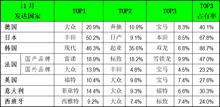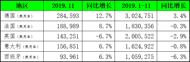 欧洲五大国11月乘用车市场全速增长,仅英国前途不明负增长,见下表。