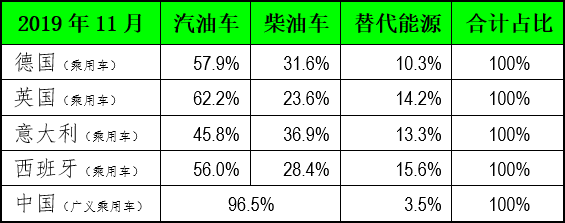 在分析欧洲国家汽车的能源结构时,可以发现仍是以汽油车为主,柴油车为辅,兼有10%以上的替代能源车,它们包含电动车、混动车、插电混动车,燃料电池车等,而中国的能源结构中,柴油车基本没有,辅以纯电动车和插电式混合动力车,近年来日系的普通混动车占比日渐增长,见下表。