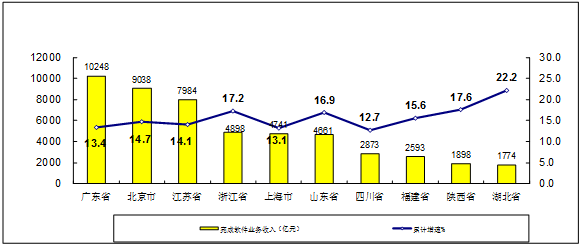 主要软件大省收入保持两位数增长,部分中西部省市增长迅速。1-10月,软件业务收入居前列的广东(同比增长13.4%)、北京(增长14.7%)、江苏(增长14.1%)、浙江(增长17.2%)、上海(增长13.1%)和山东(增长16.9%)完成业务收入合计41570亿元,占全国比重为71.8%。其中,浙江、山东增速分别高于全国平均水平2.0个、1.7个百分点。增速居前5名的省市有:广西(增长107.0%)、海南(增长64.2%)、安徽(增长30.3%)贵州(增长22.5%)和湖北(增长22.2%)。