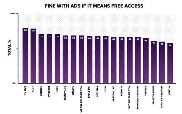 当被问及个别流媒体服务时,如果能够免费观看或收听服务,大多数用户都很乐意看到广告。
