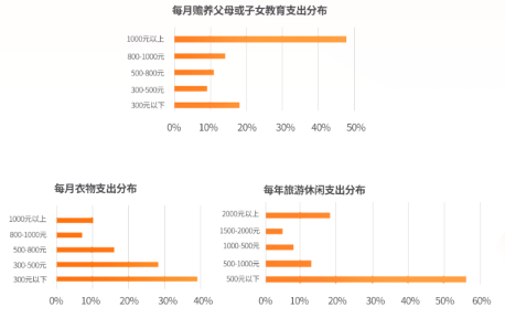 但不管已婚还是未婚,他们都具备较强的家庭责任感,48%的人在每月赡养父母或子女教育的支出是1000元以上,而每月衣物消费和每年旅游休闲的支出基本都在500元以下。