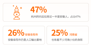 杭州的95后司机大半是安徽人,占比47%。其中,安徽阜阳市仍是人口输出重地,占比为26%。另外,杭州的95后司机群体也有着不少河南小伙的身影,占比为25%。在杭州用户眼里,他们和气又靠谱。