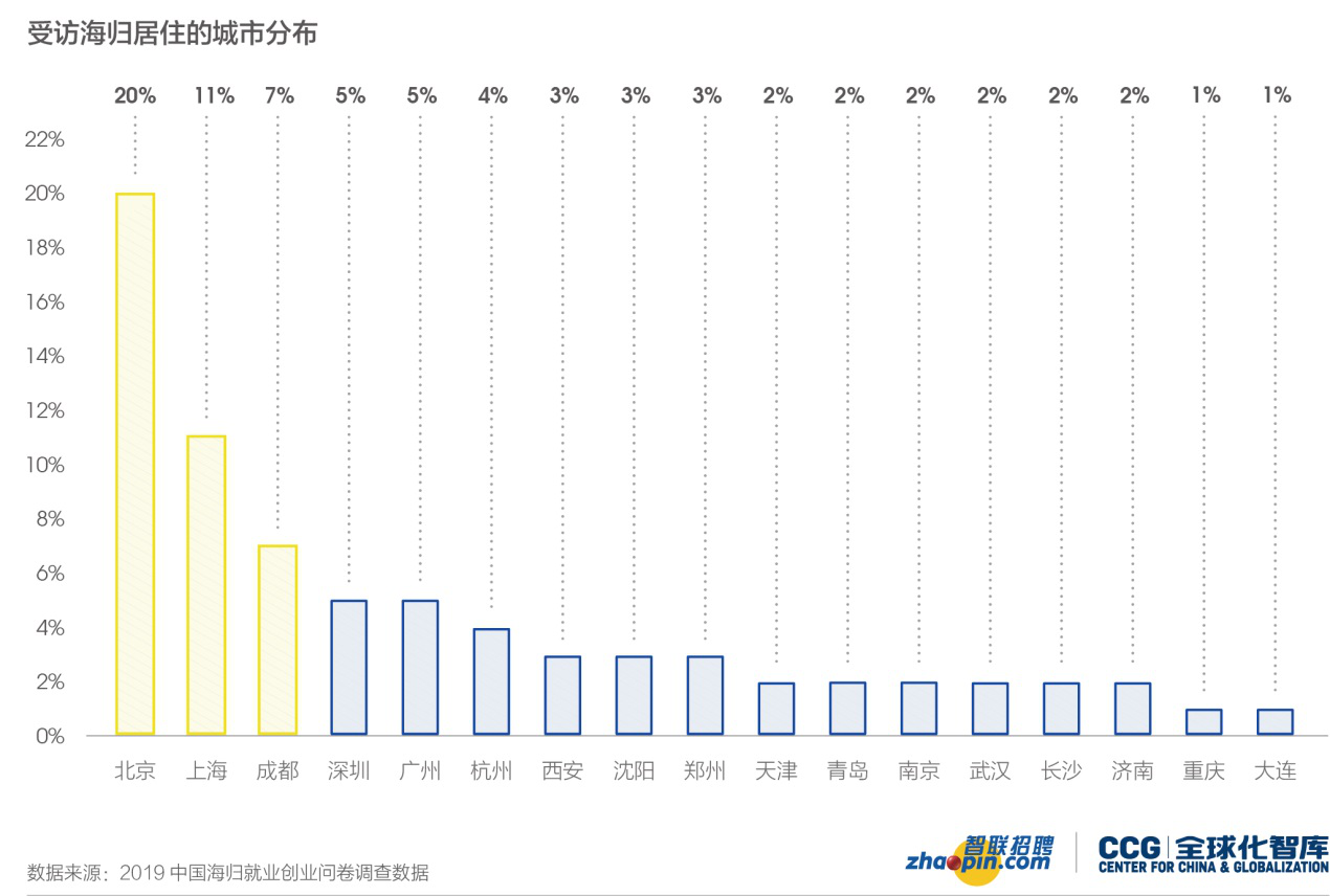 报告显示“具有国际视野”代替语言成为海归在国内发展的主要优势,“家乡”对于海归的吸引力显著上升。从受访海归的城市分布来看,上榜的17个城市中,青岛也榜上有名,显示居住在青岛的海归占比为2%。2019年,企业招聘海归平均月薪酬为10996元,高于全国招聘平均薪酬2500元左右。