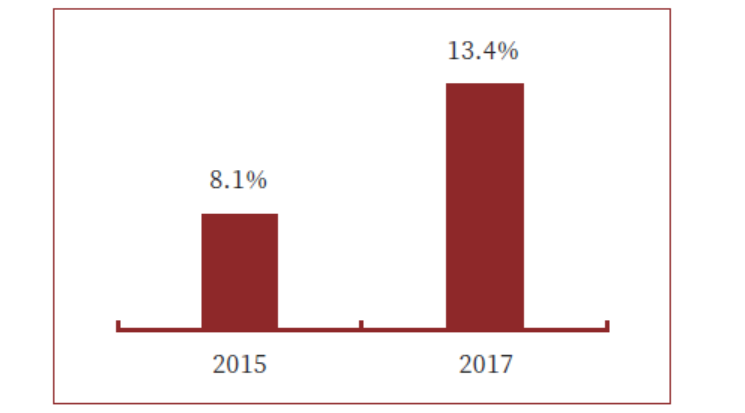 为应对劳动成本的快速上升的挑战,企业加快推进了生产的智能化升级。在此次调查样本中,使用了机器人的企业占比在2015年为8.1%,2017这一比例增长至13.4%。2015-2017年的三年间机器人投资的年均增速高达57%。