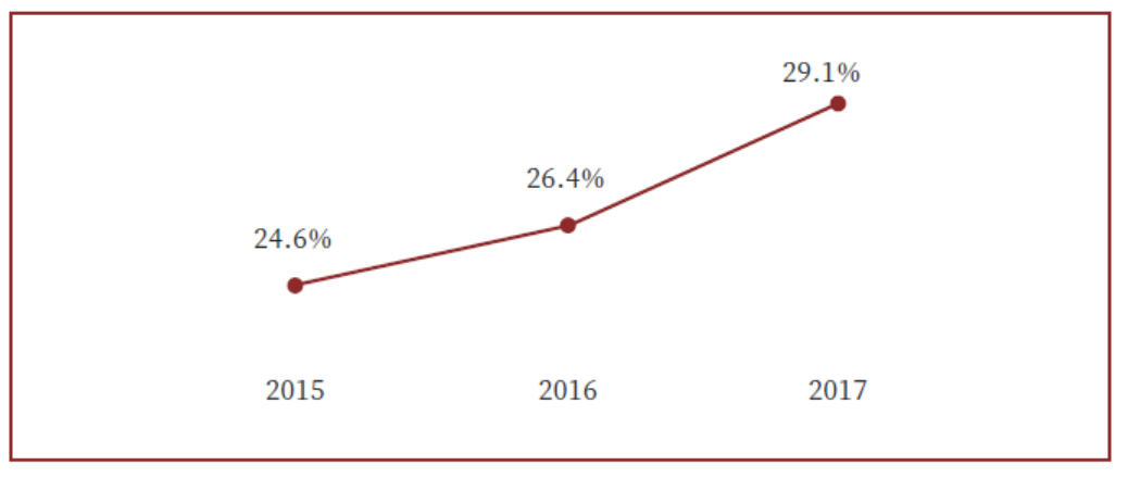 而从创新产出来看,企业的产品创新速度也在不断提升,新产品销售占比从2015年的24.6%,提升至2017年的29.1%,年均提升了2.3个百分点。
