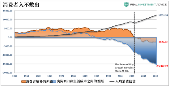 从1990年开始,收入本身已无法满足基本生活水平的需要,所以消费者转而借债以填补“空隙”。然而,在金融危机之后,收入与债务一起都无法填补“空隙”了。目前,美国人每年几乎有大约2600美元的赤字无法填补。