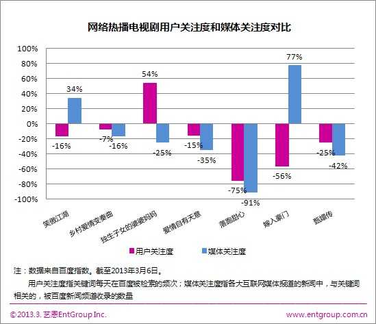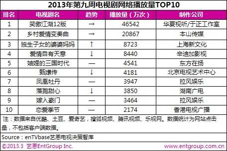 据enTVbase艺恩电视决策智库统计,2013年第九周网络TOP10电视剧累计播放量10.7亿次,《笑傲江湖》和《乡村爱情变奏曲》冠亚军位置稳定。本周4部新上榜剧中有2部是拉风娱乐出品。“婆妈剧”回归,电视剧《独生子女的婆婆妈妈》涨幅较快,超越爱情偶像剧《爱情自有天意》,跃居季军位置。