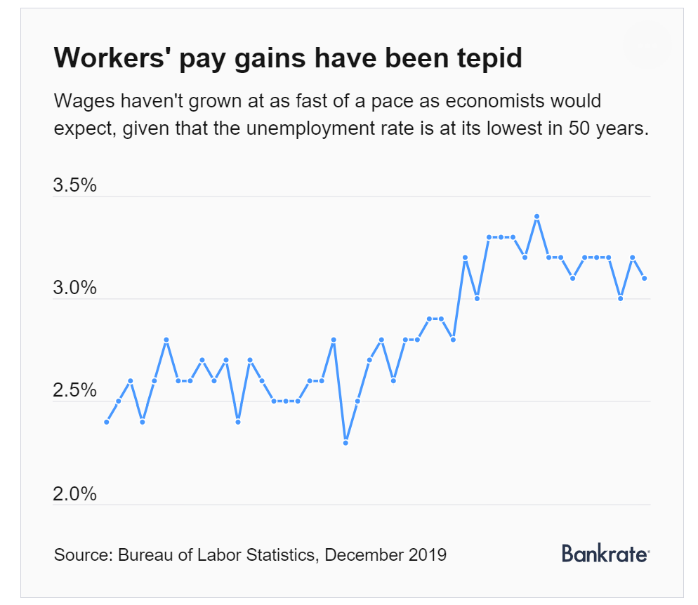美国劳工部11月就业报告显示,平均时薪较去年同期增长3.1%。但直到2018年10月,工资才突破3%的年增长率。