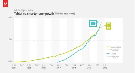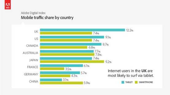 Adobe 对2007年6月至今全球超过1,000家网站上的超过1,000亿次访问进行了追踪,对比了来自平板电脑和来自智能手机的页面浏览量变化,关注的市场地 区有英国、美国、中国、加拿大、澳大利亚、日本、法国和德国。数据显示,智能手机和平板电脑的页面浏览量份额分别为8%和7%,差异并不大。