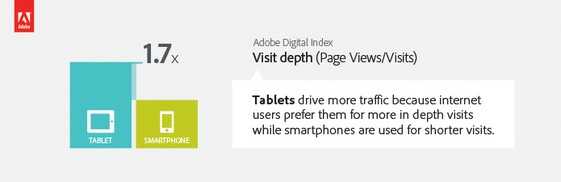 Adobe 认为,平板电脑页面浏览量之所以迅速增长,主要是因为平板电脑的尺寸极其适合浏览网页。与智能手机相比,平板电脑在屏幕尺寸上占有明显优势。Adobe发 现,互联网用户使用平板电脑时,平均每次上网访问的页面数量比使用智能手机时多70%——也就是说,平板电脑的上网活动更具“深度”。