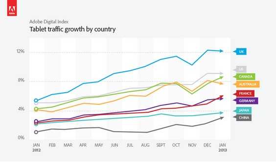 在Adobe关注的所有8个国家中,来自平板电脑的流量份额都在2012年翻了一番。Adobe预计,这一趋势在2013年仍将继续。Adobe还指出,去年11月某些国家平板电脑流量份额略有下降,主要是PC流量的增长造成的,而平板电脑的页面浏览量并未下降。