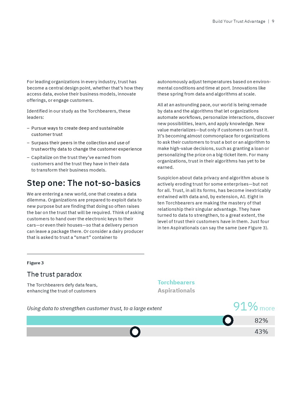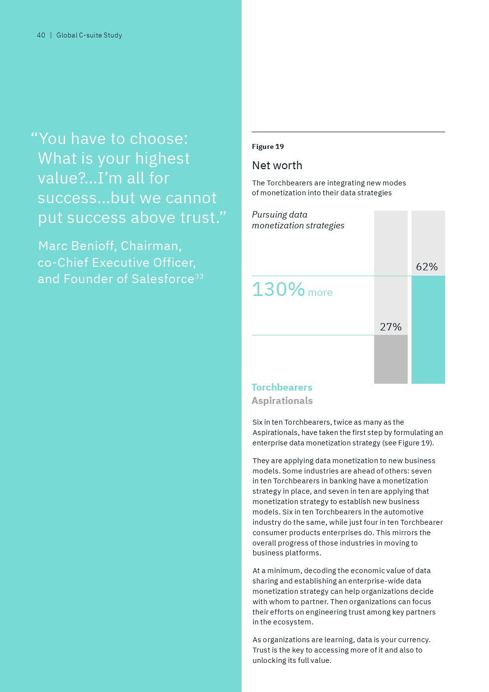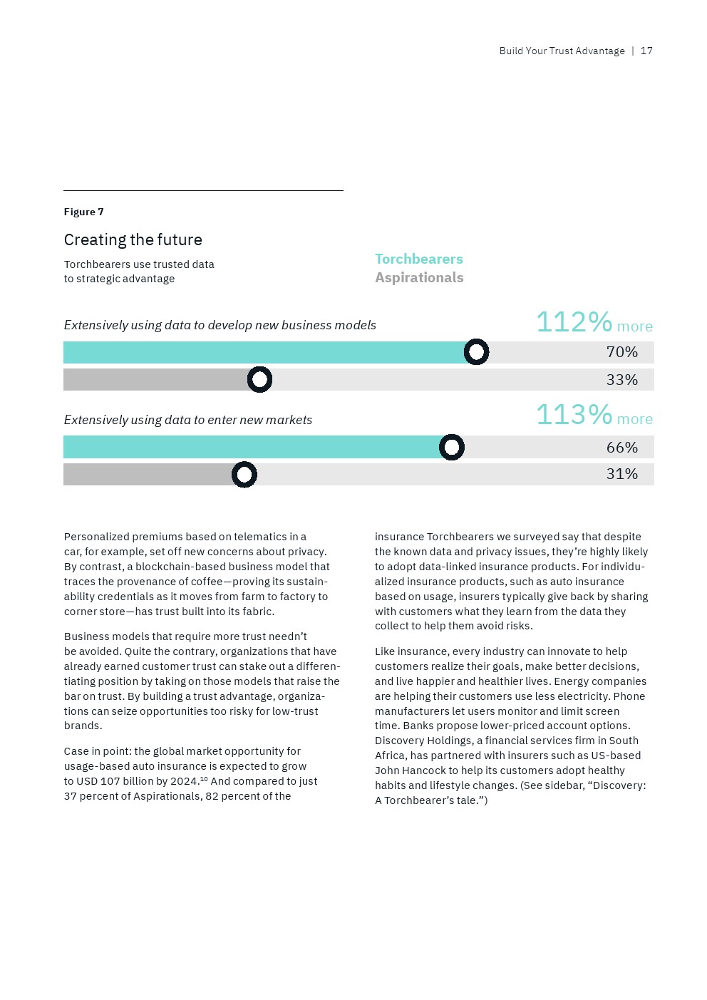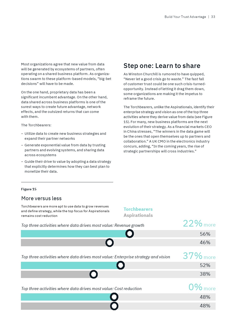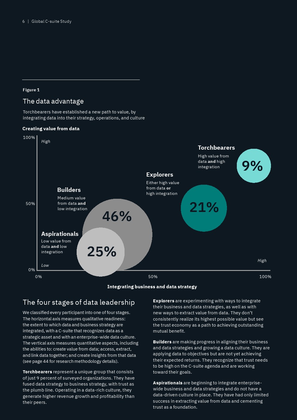 IBM从接受调查的13000多名高管筛选出“数据领导者”,即排名前9%的高管人员,他们代表了那些“将数据战略与业务战略融合在一起,以信任为垂线”的全球性企业。另一方面,还有25%的“后进”受访者才刚刚开始“整合企业范围的业务和数据战略,并没有数据驱动的文化”。