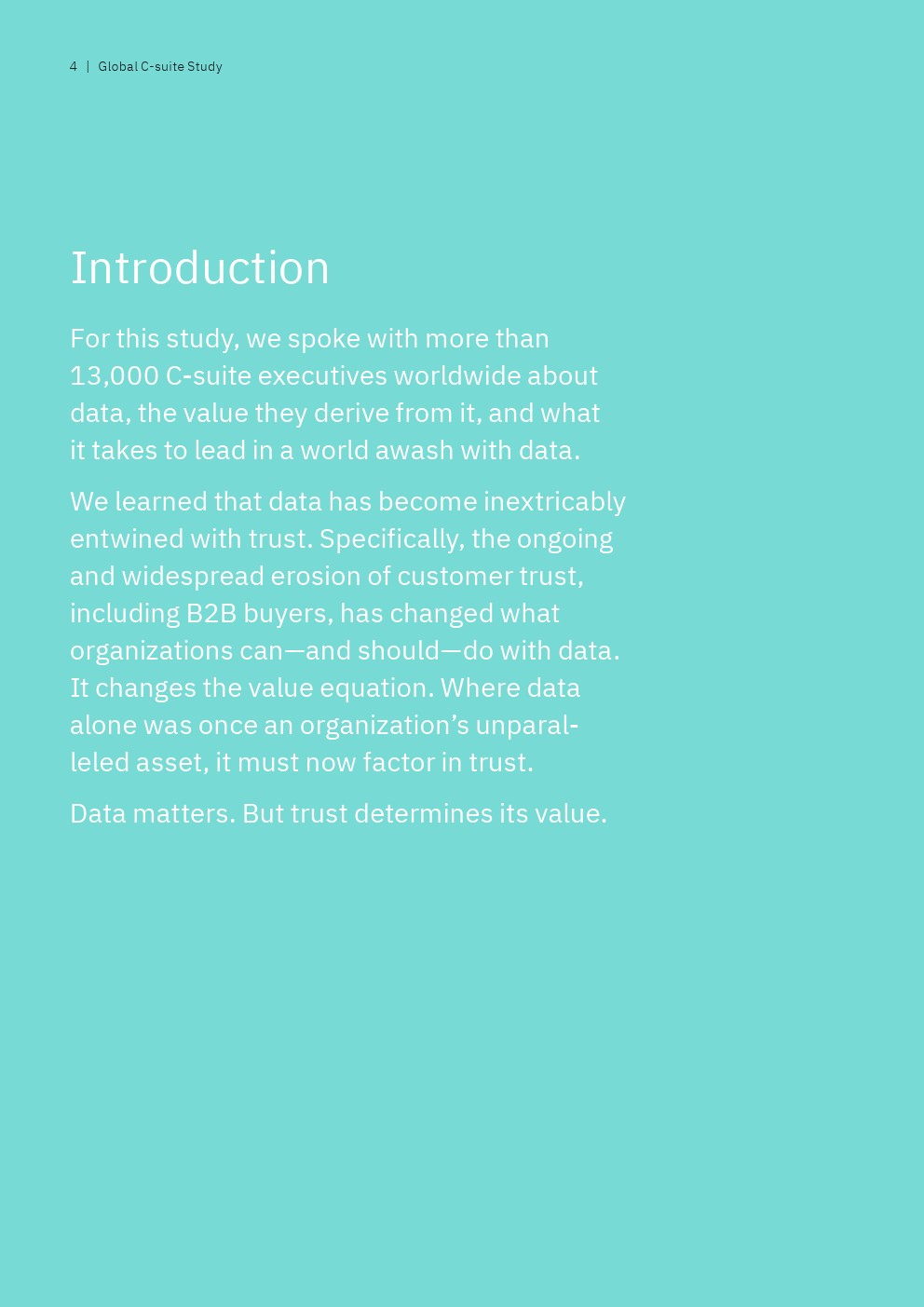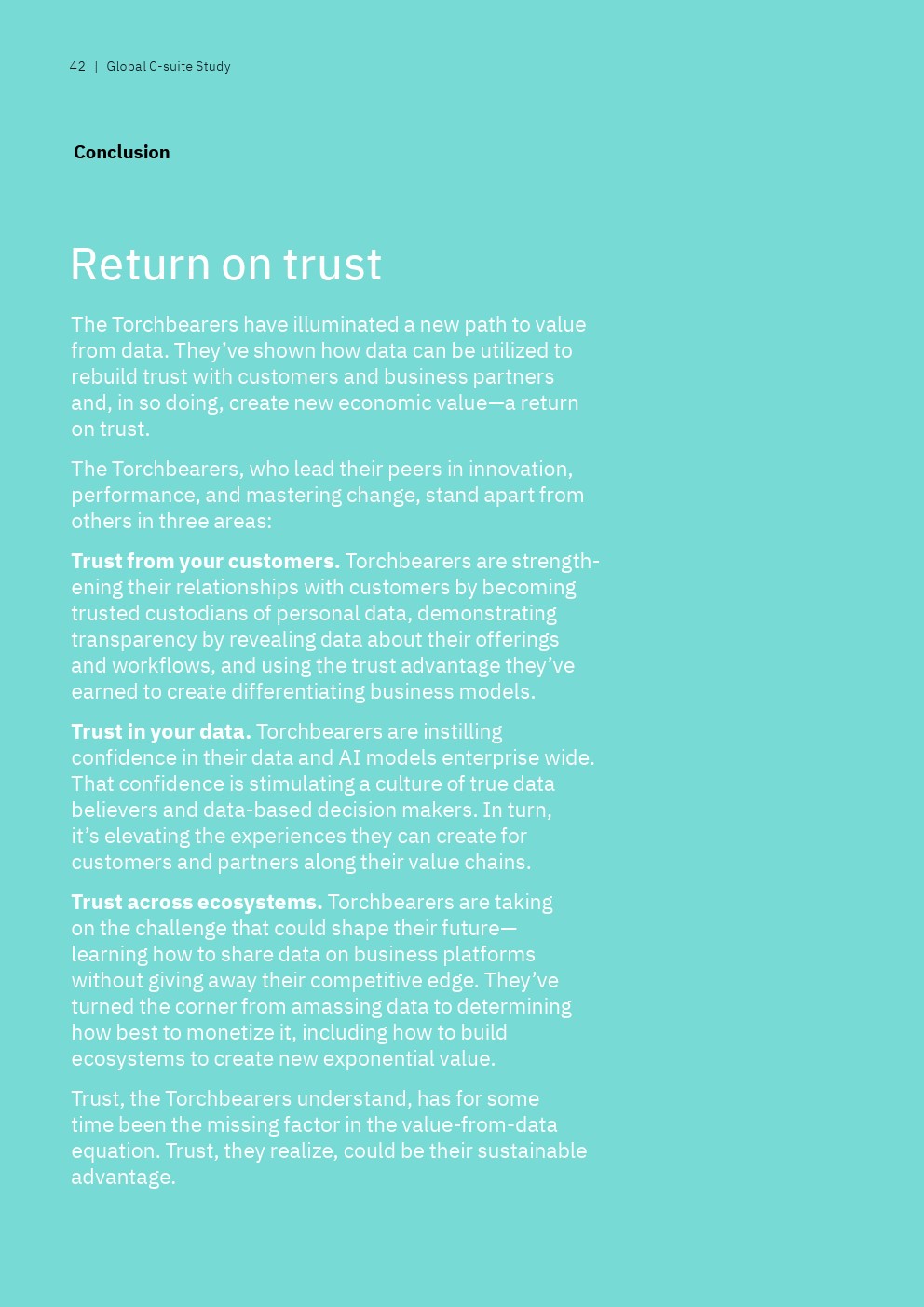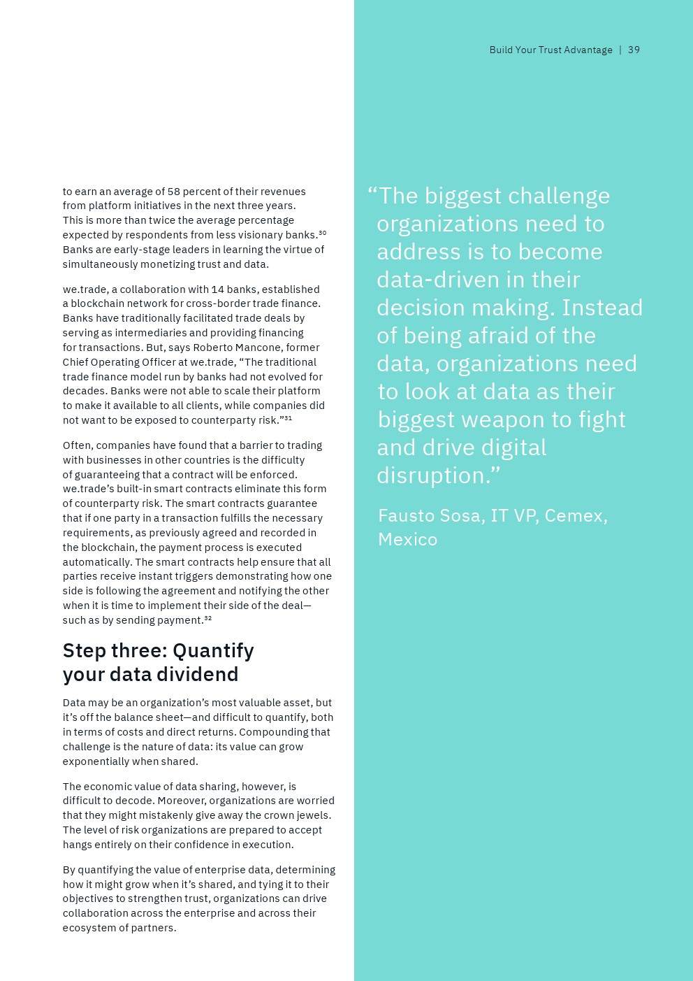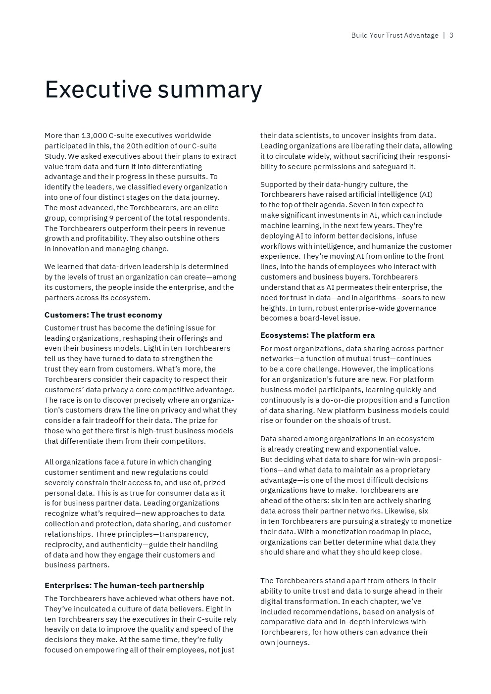IBM从接受调查的13000多名高管筛选出“数据领导者”,即排名前9%的高管人员,他们代表了那些“将数据战略与业务战略融合在一起,以信任为垂线”的全球性企业。另一方面,还有25%的“后进”受访者才刚刚开始“整合企业范围的业务和数据战略,并没有数据驱动的文化”。