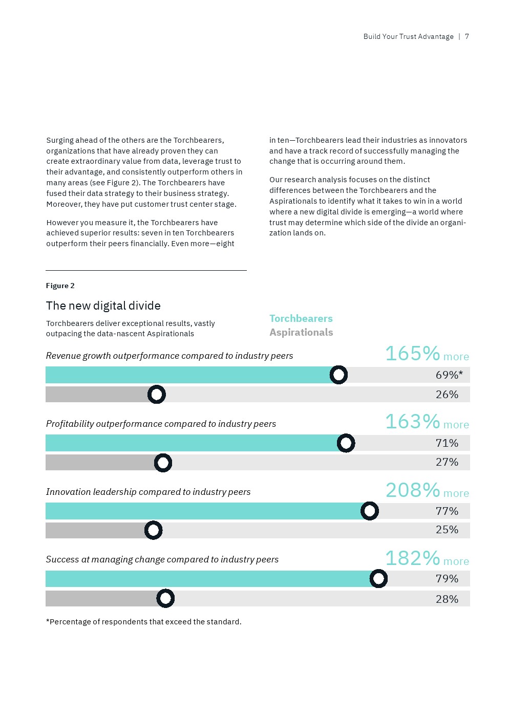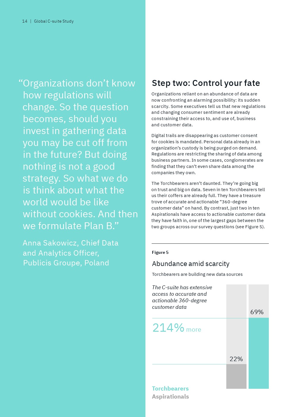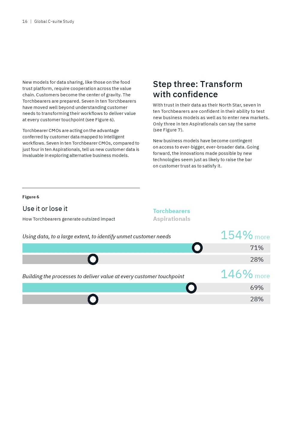 与此同时,很少有后进企业的高管(22%)表示他们的首席执行官可以广泛地访问准确且可操作的360度客户数据,而69%的领袖企业高管有这种能力。