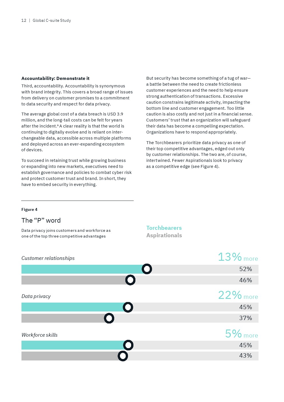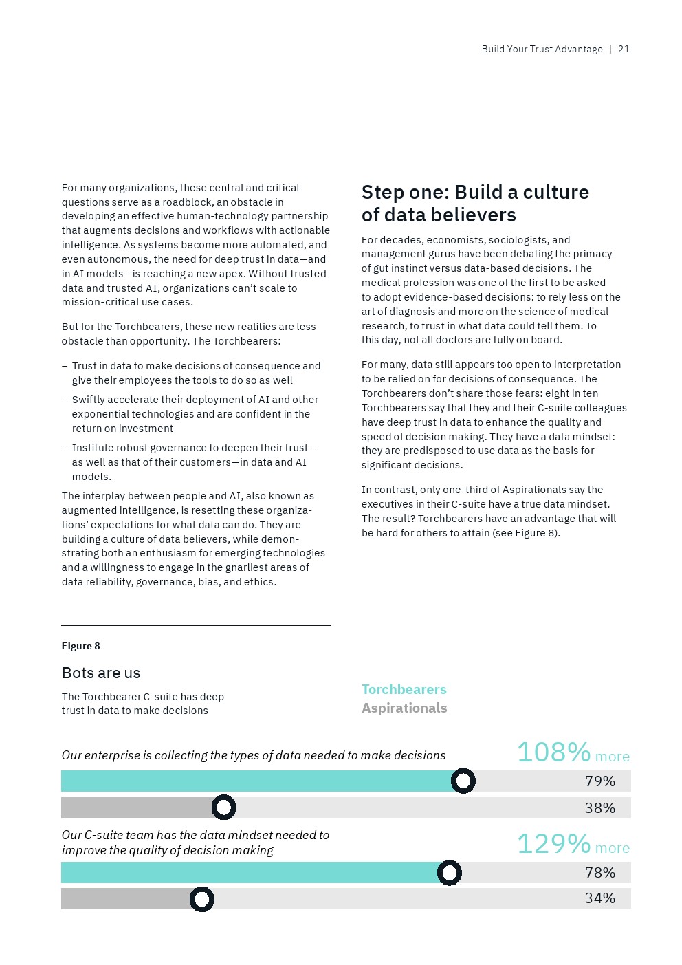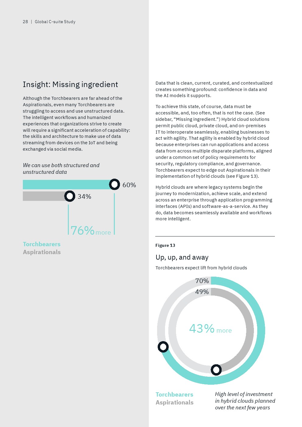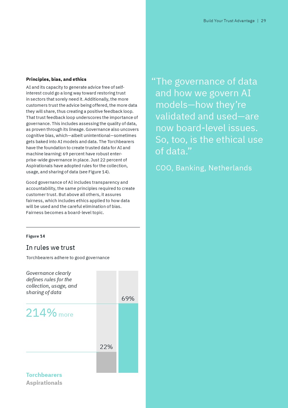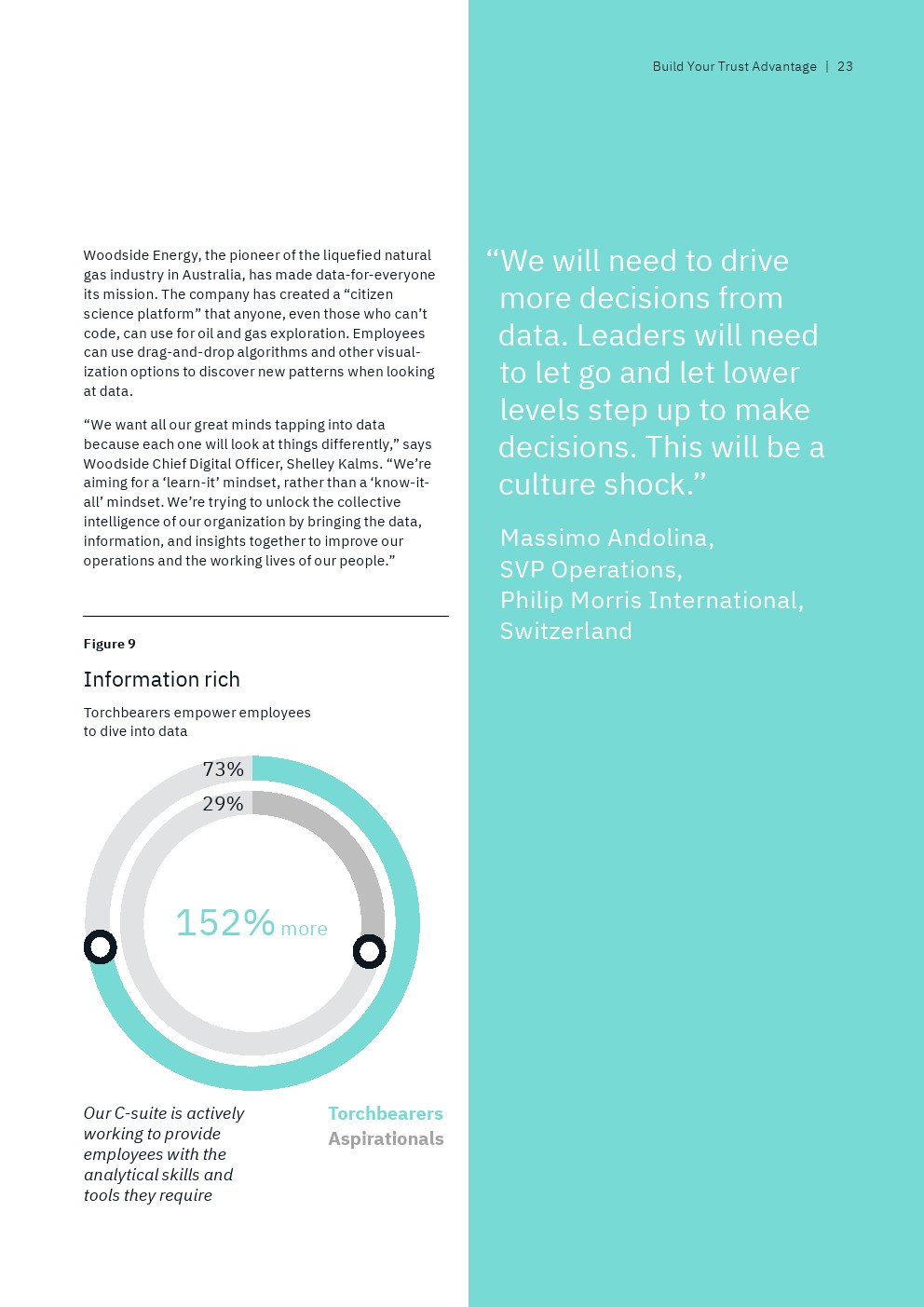 数据治理也是一个关键话题。只有22%的后进企业明确定义了收集、使用和共享数据的规则,相比之下,69%的领袖企业的高管已经有这些规则。