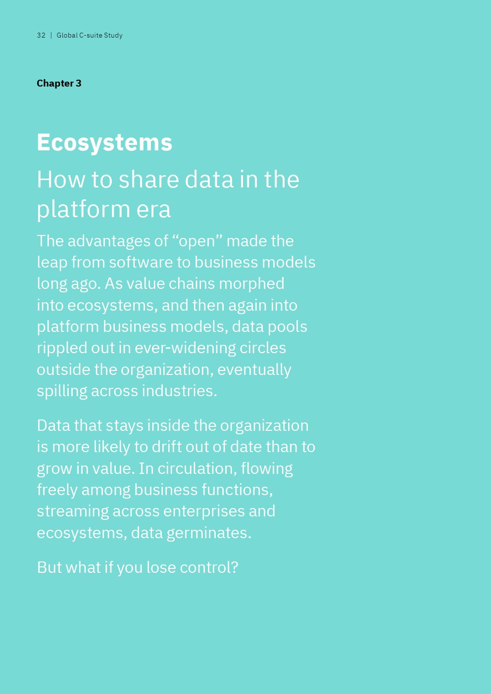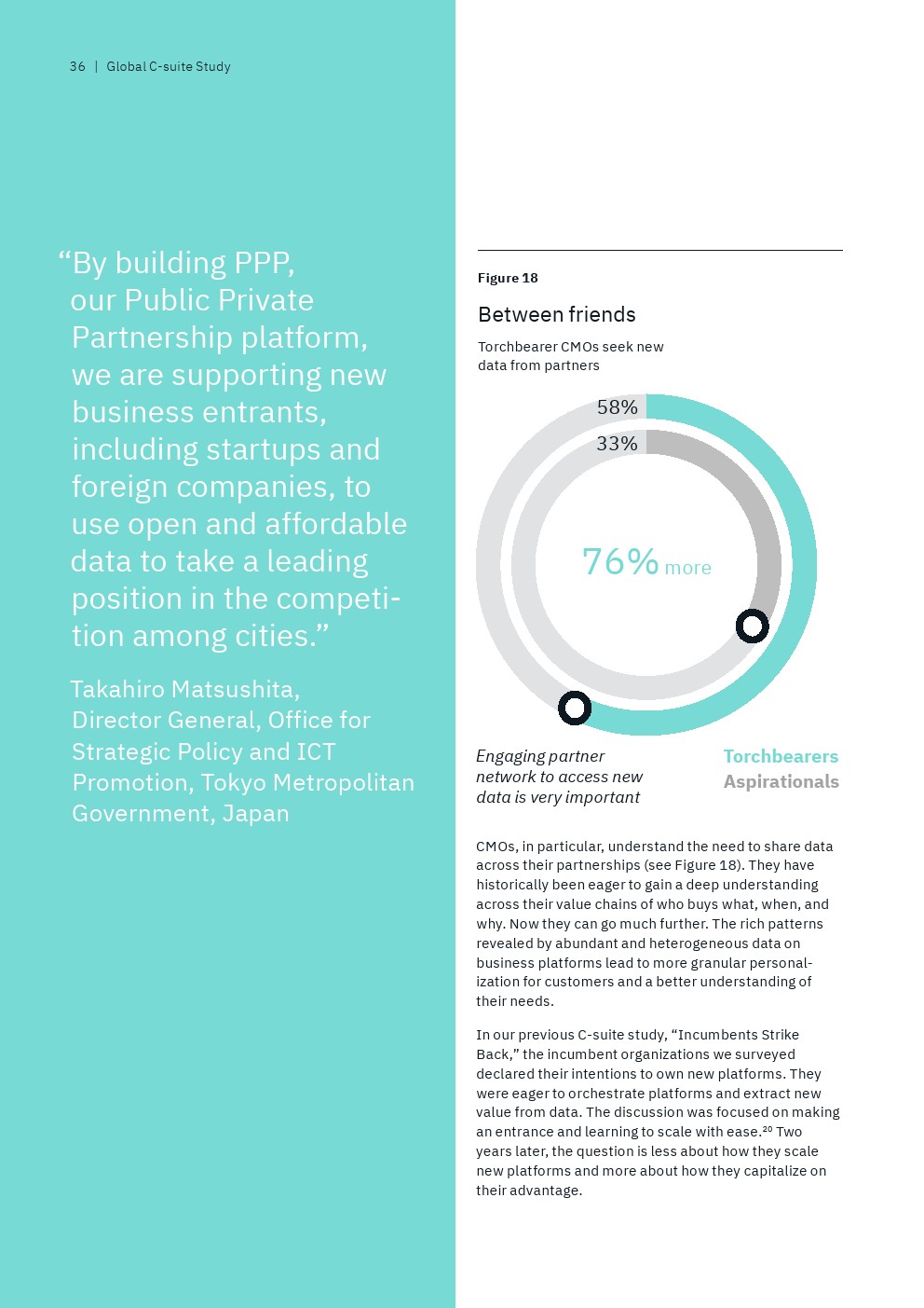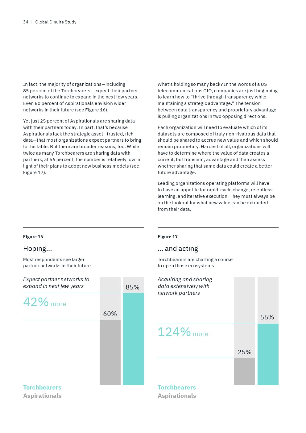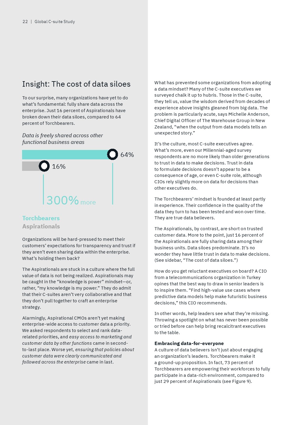 领袖企业和后进企业的高管人员之间的另一个显著区别是他们与其他业务领域共享数据的方式。前者(64%)比后者(16%)更有可能在其他职能业务领域自由共享数据。
