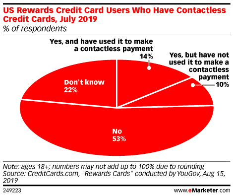 非接触式银行卡是有近场通信(NFC)芯片的信用卡或借记卡,只需轻按阅读器即可完成交易。美国推出非接触式银行卡相对较晚,但是,由于大多数销售点(POS)系统都具有NFC功能,可以读取这些卡,因此非接触式银行卡已经开始在美国普及。根据CreditCards.com和YouGov 2019年7月的一项研究,在接受调查的美国信用卡用户中,14%拥有非接触式银行卡并曾使用它进行支付。