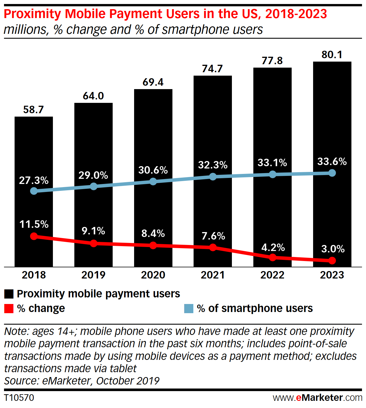 这仍然是一个相对较小的数字,但随着非接触式交通和购物选项的增加,eMarketer预计这一数字在2020年及以后将继续呈现健康增长。